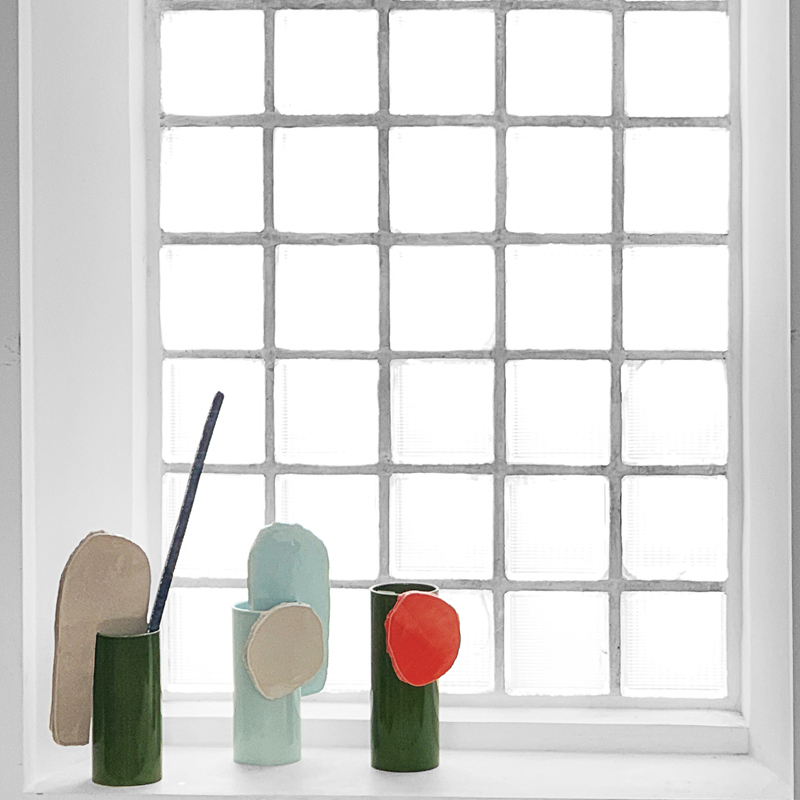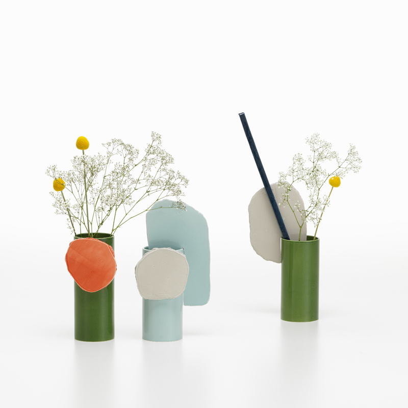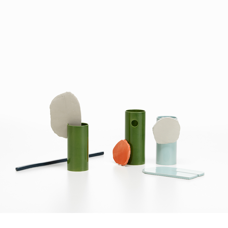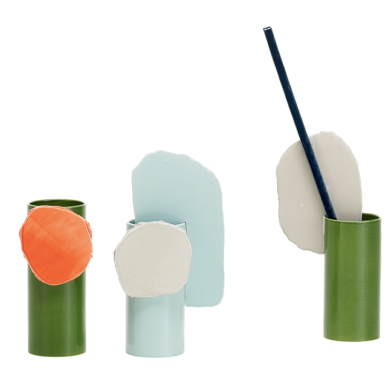 Découpage vases each consist of a cylindrical cast vessel and a set of abstract clay plates and bars that can be fixed or placed inside the vase. All elements have a distinct handcrafted appearance and are available in a variety of colours - together they create poetic compositions with an appearance that changes from one angle to the next: fanciful, ironic, unusual, alive. “The arrangements form a fragile balance, as the contrasting colours and layers converge to create a new harmony,” says Bouroullec. The