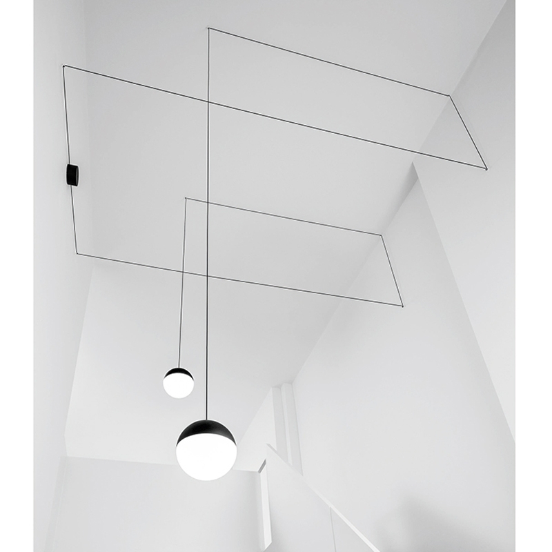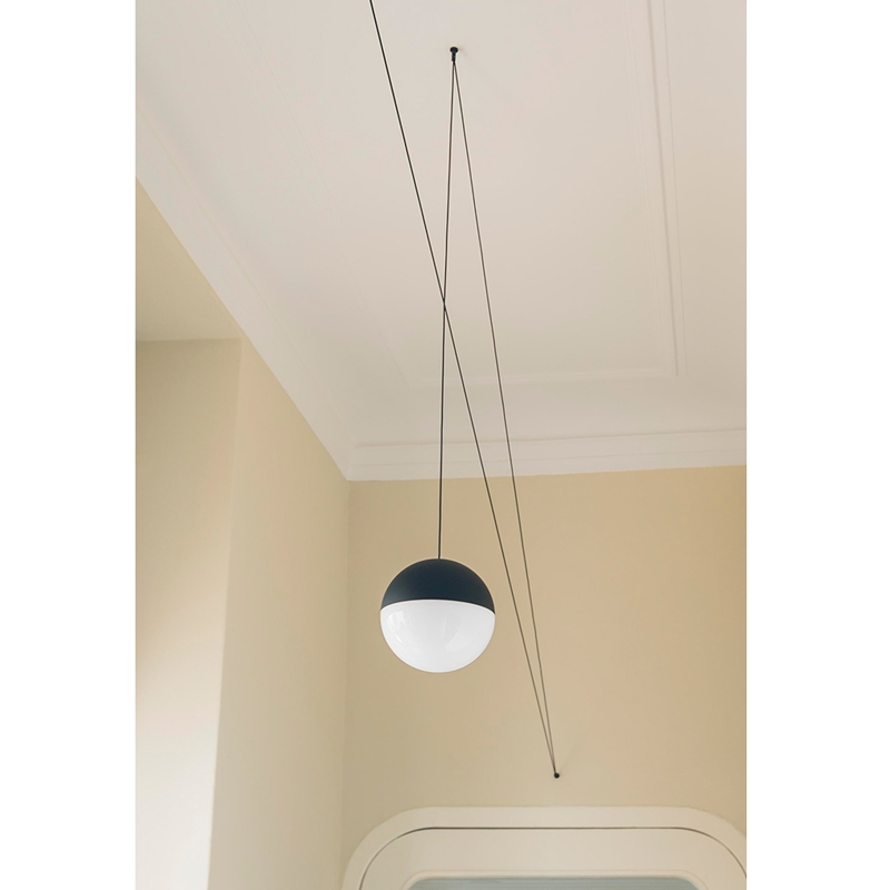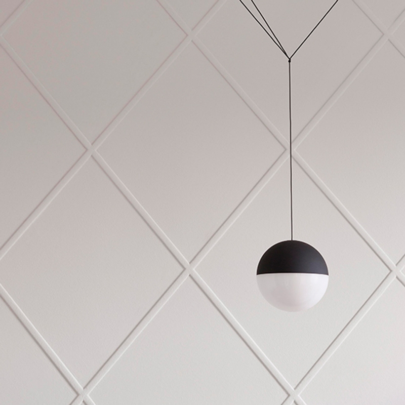 With String Light, Michael Anastassiades has created a suspension light with minimalist lines. Available in cone or ball shape, the light consists of a black painted die-cast aluminium body and a polycarbonate diffuser. It is equipped with a 12-metre Kevlar-reinforced cable, which is an integral part of the light. Indeed, thanks to a set of five hooks, the cable creates geometric lines and thus totally personalises your light and your room. Alone or in a composition of several elements, String creates a new space and brings an architectural touch. A floor switch and a ceiling or wall rose can be ordered separately.