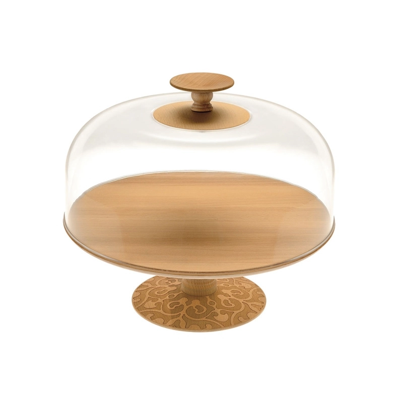 Dessinée par Marcel Wanders, la collection « Dressed in wood» comprend un plat à gâteau et un centre de table en bois de hêtre ornés de motifs en relief, et une cloche réalisée en PMMA avec un pommeau en bois. Caractérisé par ses nœuds et ses veines, le bois fait de chaque objet une pièce unique. Cette collection d'objets en bois pour la cuisine est réalisée par des artisans travaillant dans la Vallée Strona, qui part de 1300 mètres d'altitude et descend jusqu'au lac d'Orta où se situe le siège d'Alessi. Dans cette vallée la production d'objets en bois est documentée depuis le 16ème siècle. Entre tradition et modernité, la collection Dressed in Wood se démarque par ce subtil mélange de baroque et de sobriété moderne. Plat vendu séparément