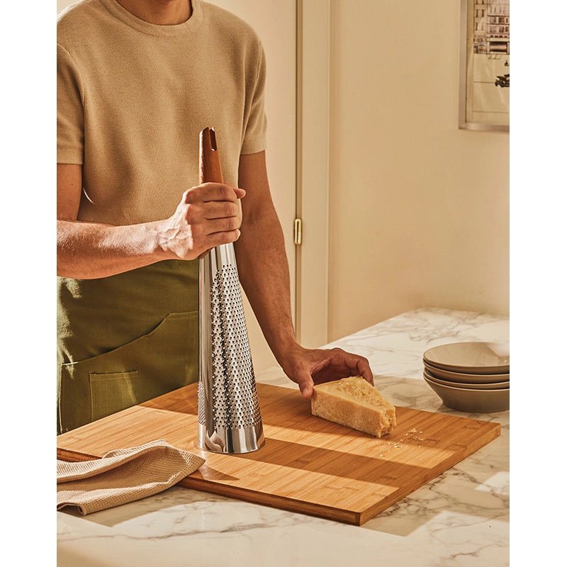 La râpe à fromage et noix de muscade Todo, en acier et bois, est une réalisation de Richard Sapper pour Alessi en 2004. Ce célèbre designer a dessiné les objets les plus innovants pour l'éditeur italien. Pour cette râpe de cuisine, il s'est inspiré de son expérience personnelle lorsqu'il avait la lourde tâche de râper du fromage pour toute la famille. Grâce à la coupe exceptionnelle offerte par le long corps tronconique, Todo permet de râper en une seule passe la quantité de fromage nécessaire pour une seule assiette. Il est un excellent exemple d'objet à exhiber sur la table ou dans la cuisine, et doté aussi d'une fonctionnalité précise et innovante qui transforme une des opérations culinaires les plus ennuyeuses et les moins gratifiantes en un geste ludique.Un bel objet à mettre sur toutes les tables.
