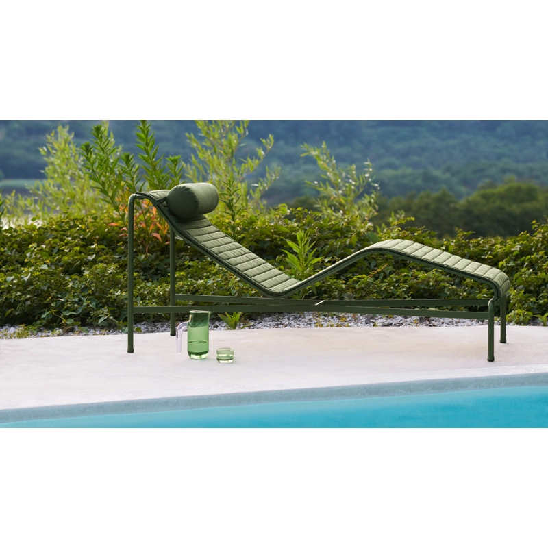 Coussin matelassé conçu pour la chaise longue Palissade. Il est conçu dans un tissu spécial pour l'extérieur, résistant à l'eau. Il se fixe facilement à la chaise longue grâce à des velcros. La chaise longue Palissade a été conçue par le duo de designers français Ronan et Erwan Bouroullec pour la marque Hay. La série Palissade est composée d'une large gamme de mobilier, dans laquelle toutes les pièces partagent le même principe de conception. Elle comprend des chaises, petits fauteuils, fauteuils lounge, tabourets, tables, bancs… Spécialement conçues pour un usage extérieur, ces pièces sont visuellement légères mais robustes dans leur réalisation.