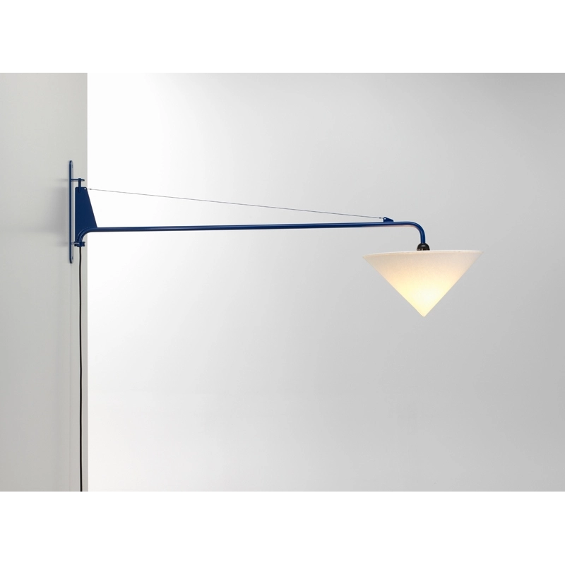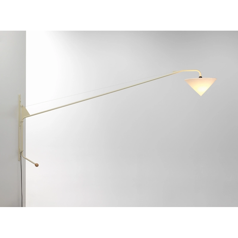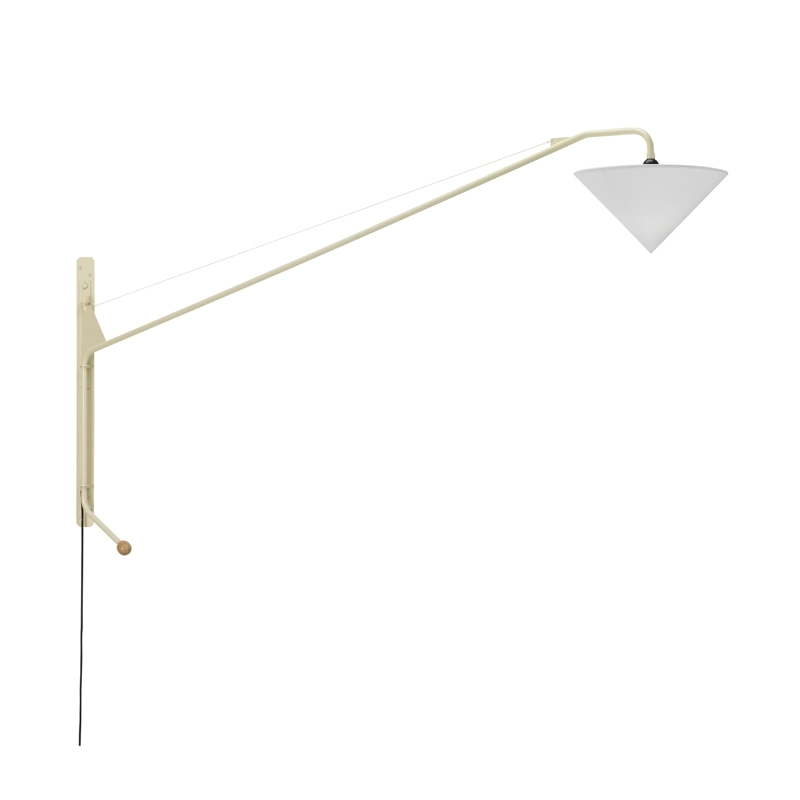 Durant les années 1940, Jean Prouvé a conçu la lampe murale Potence pour sa propre maison à Nancy : une simple ampoule fixée à une longue barre pivotante en acier, maintenue par un fil d‘acier. En 1947, il développe un abat-jour de forme conique qui s‘adapte aux différentes versions et tailles de Potence.