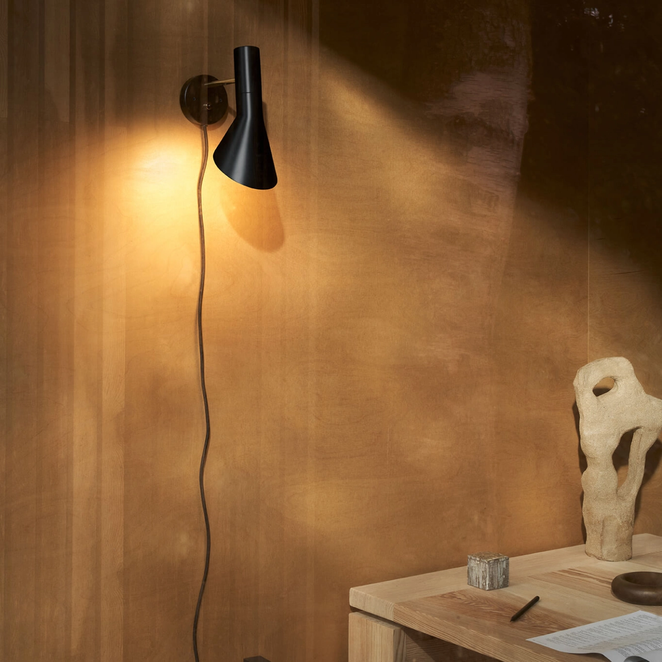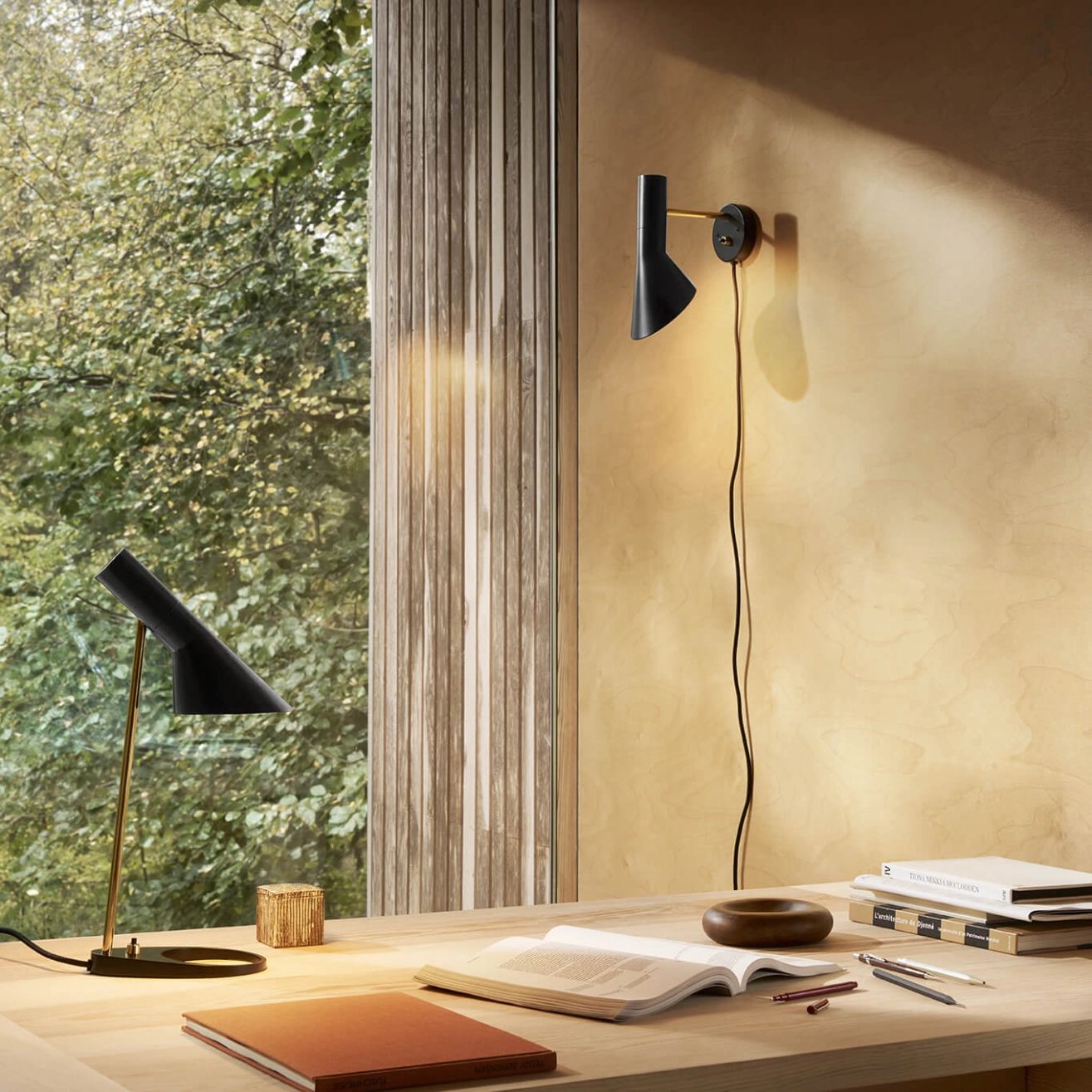 Dessinés par Arne Jacobsen et édités par Louis Poulsen en 1960 pour le SAS Royal Hôtel à Copenhague (Radisson Blu), les luminaires AJ faisaient partie, à l’origine, du concept de design complet créé pour l'Hôtel. Arne Jacobsen a non seulement dessiné les plans de l’hôtel, mais aussi imaginé dans les moindres détails la décoration intérieures de ce dernier. Bon nombre de produits dessinés à cette occasion sont aujourd'hui des icones du design, comme les fauteuils Egg et Swan. L’applique AJ se caractérise par la forme asymétrique particulière de son abat-jour orientable. Elle est constituée d’une base ronde, d’un pied tubulaire et d’un diffuseur conique de forme tronquée. L’intérieur de l’abat-jour est peint en blanc afin de rendre la lumière plus confortable. Le diffuseur orientable et l’intérieur de l’applique AJ Wall est peint en blanc, afin de rendre la lumière plus douce et confortable. Cette applique associe un design pur et intemporel à d’excellentes qualités d’éclairage. Aujourd’hui perçue comme une icône du design scandinave, elle est synonyme d’élégance et de légèreté. L’applique AJ émet une lumière asymétrique, directe et puissante, dirigée vers le bas. Les lampes AJ ont obtenu également une renommée mondiale. Les luminaires AJ de Louis Poulsen restent au fils du temps des classiques modernes dans le domaine des luminaires design.