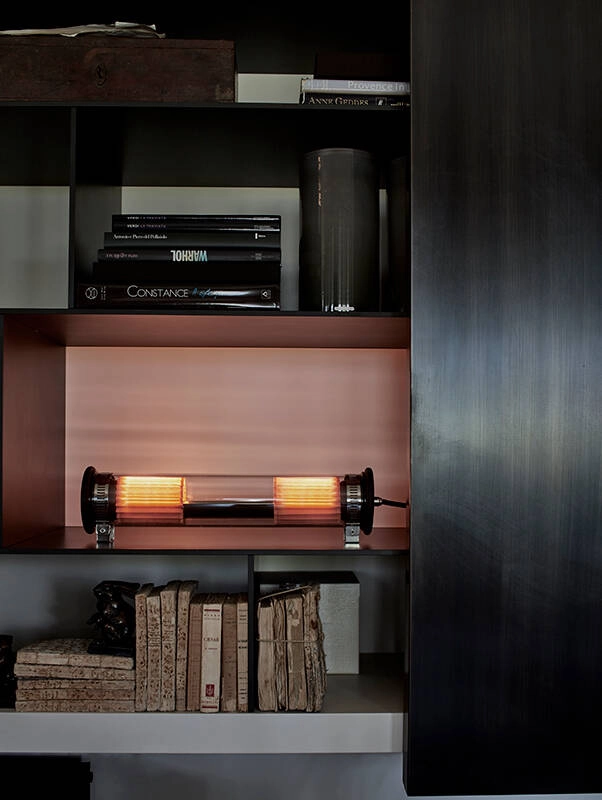 La collection « IN THE TUBE » est composée de modèles forts, figures libres et contraintes à la foi. IN THE TUBE et proposée en verre borosilicate, fermée de bouchons d’aluminium, capée de silicone, avec colliers de fixation en acier inoxydable. IN THE TUBE diffuse une lumière filtrée, adoucie, orientée par le simple positionnement fixe ou amovible d’une maille-filtre façonnée ou d’un réflecteur, dont le matériau même « donne » la couleur.