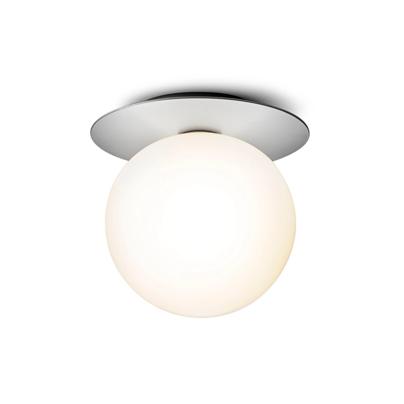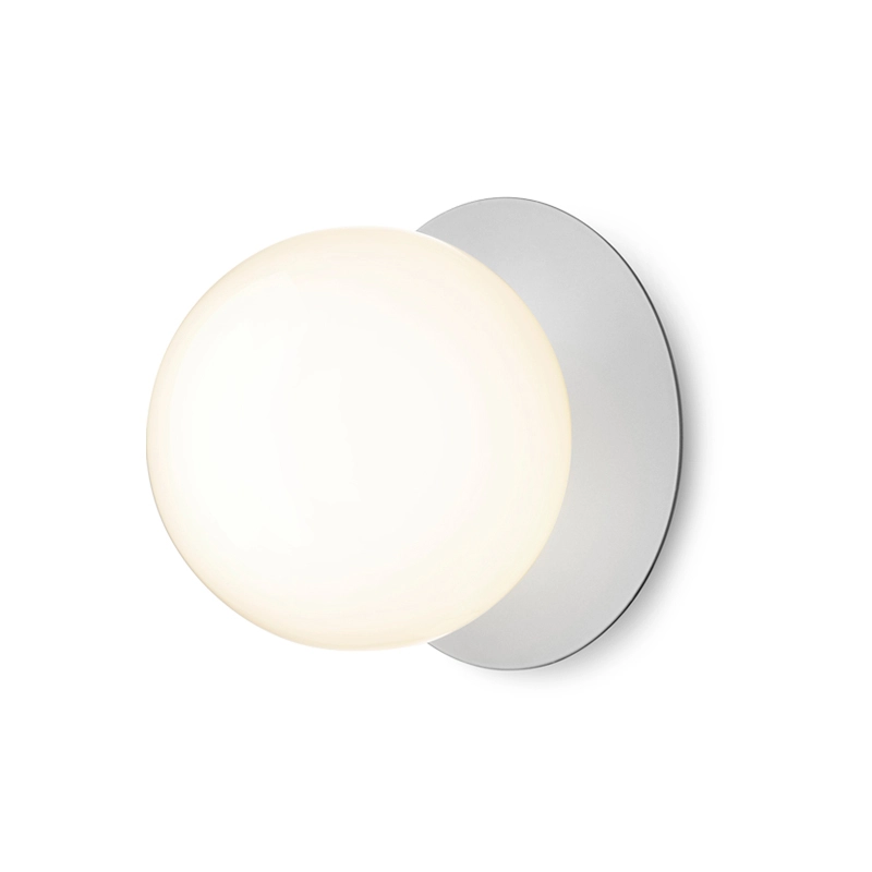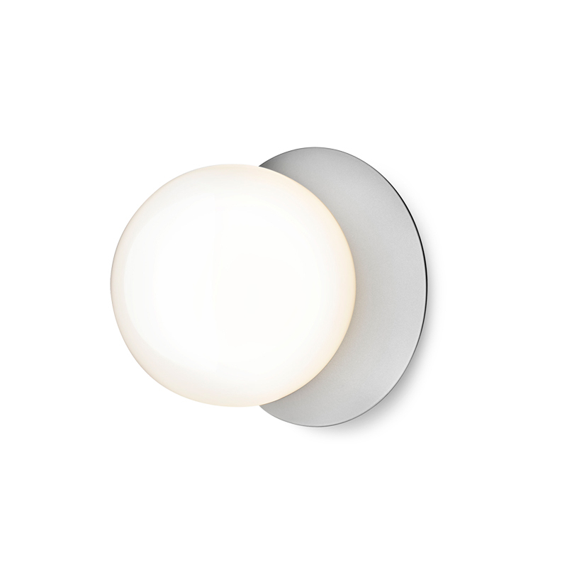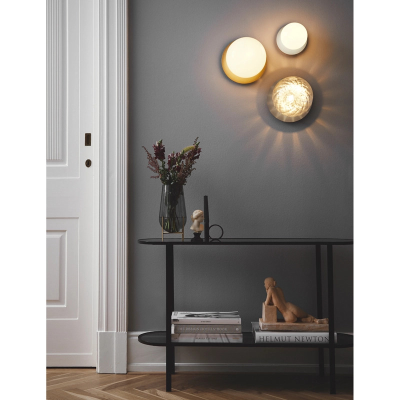 lampe Liila consiste en une feuille de métal ronde associée à une sphère en verre soufflé finition blanc opalin ou transparent avec un motif en relief. La version en verre transparent avec motif en relief crée des jeux de lumière scintillants, tandis que le modèle blanc opalin émet une lumière tout en douceur. Disponible en deux tailles, la