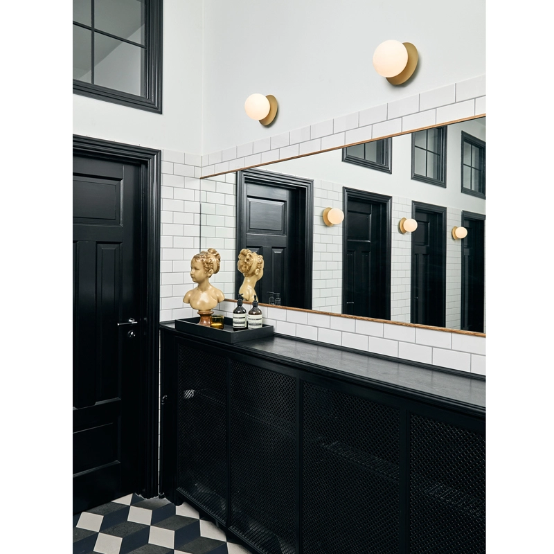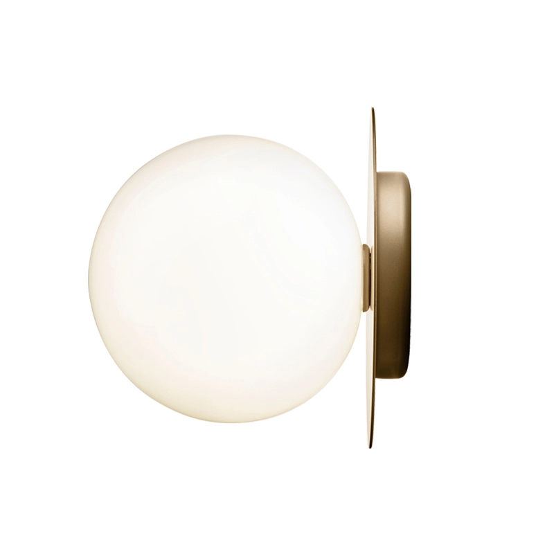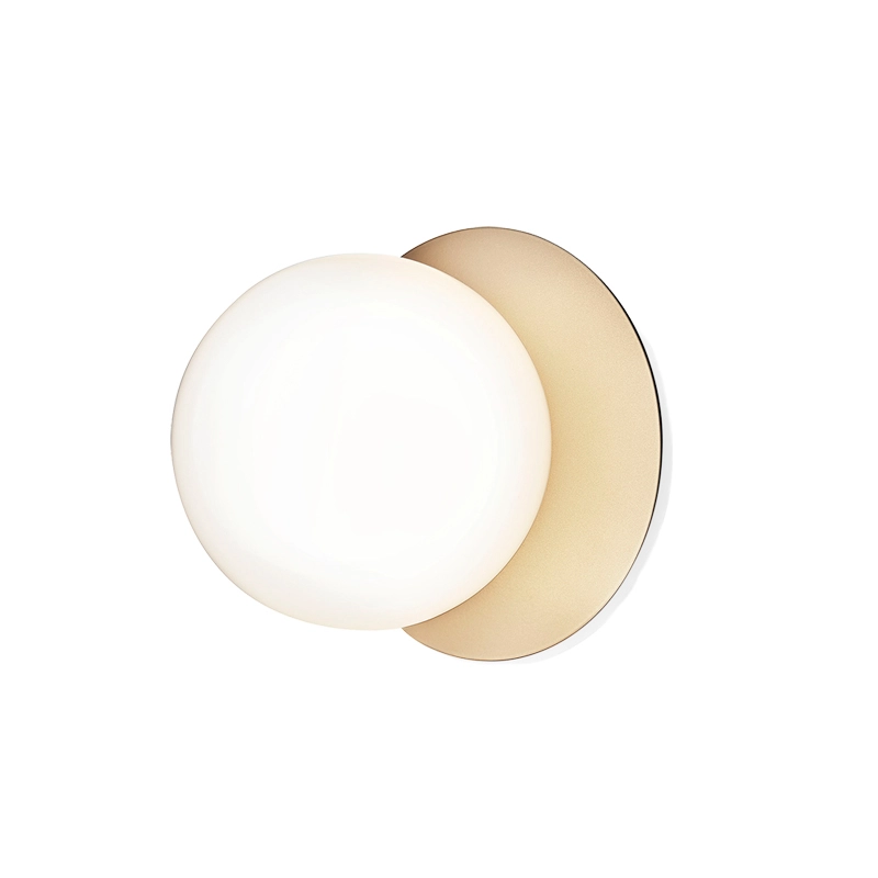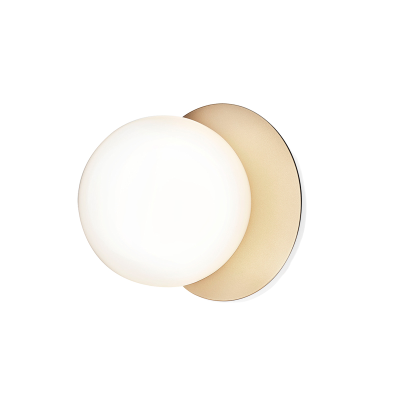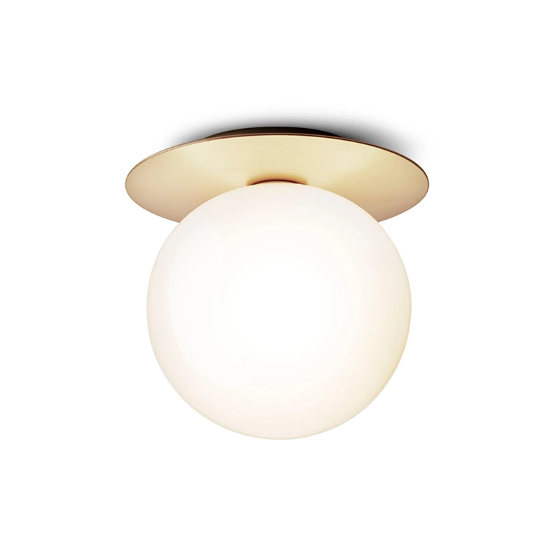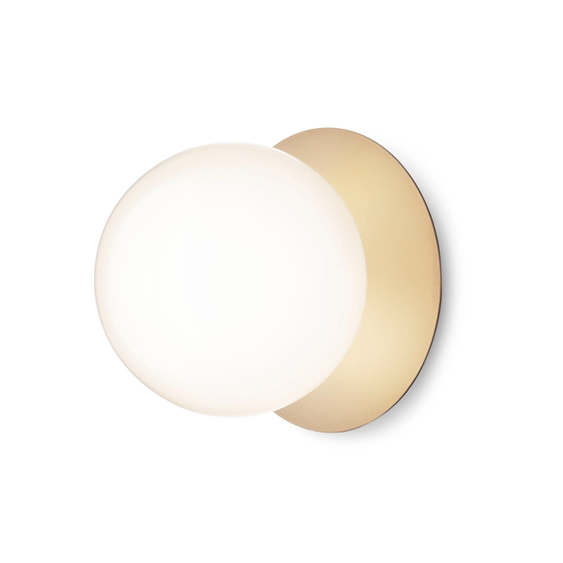 lampe Liila consiste en une feuille de métal ronde associée à une sphère en verre soufflé finition blanc opalin ou transparent avec un motif en relief. La version en verre transparent avec motif en relief crée des jeux de lumière scintillants, tandis que le modèle blanc opalin émet une lumière tout en douceur. Disponible en deux tailles, la