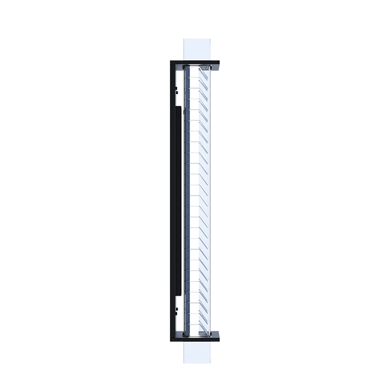 verre borosilicate, grille à lamelles inclinées en aluminium, structure tôle métallique laquée noire