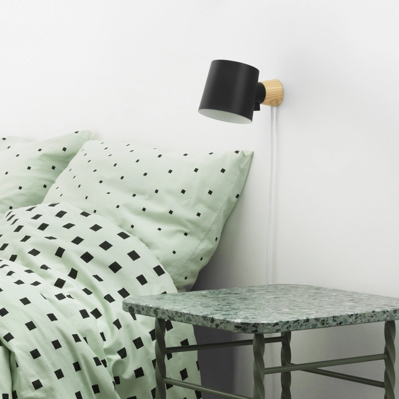 applique Rise. Marianne Andersen a souhaité créer un objet immédiat et intuitif, ne laissant voir que ses éléments indispensables. Elle se compose d'un socle en bois de frêne et d'un abat-jour cylindrique assemblés à l'aide d'un joint pivotant, ce qui permet diriger la lumière diffusée faisant tourner l'abat-jour sur le socle. Ainsi, un simple mouvement permet d'alterner entre éclairage direct ou indirect, ce qui fait de