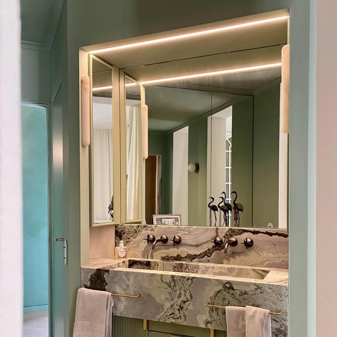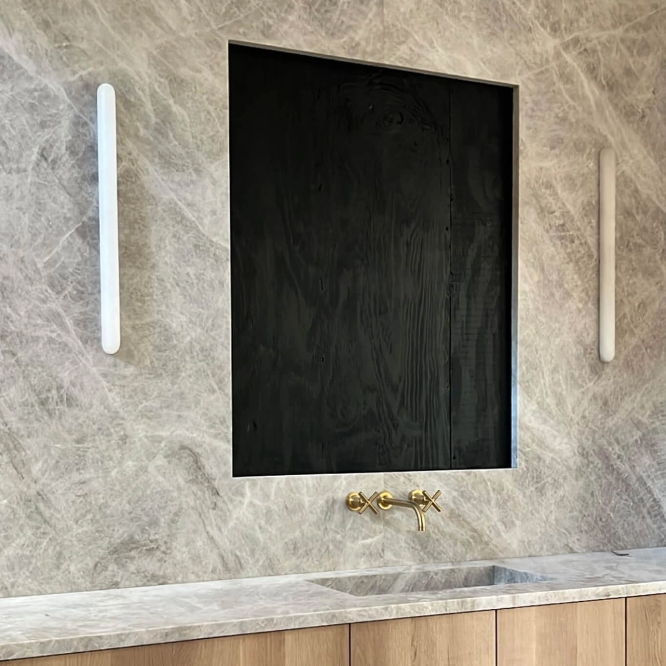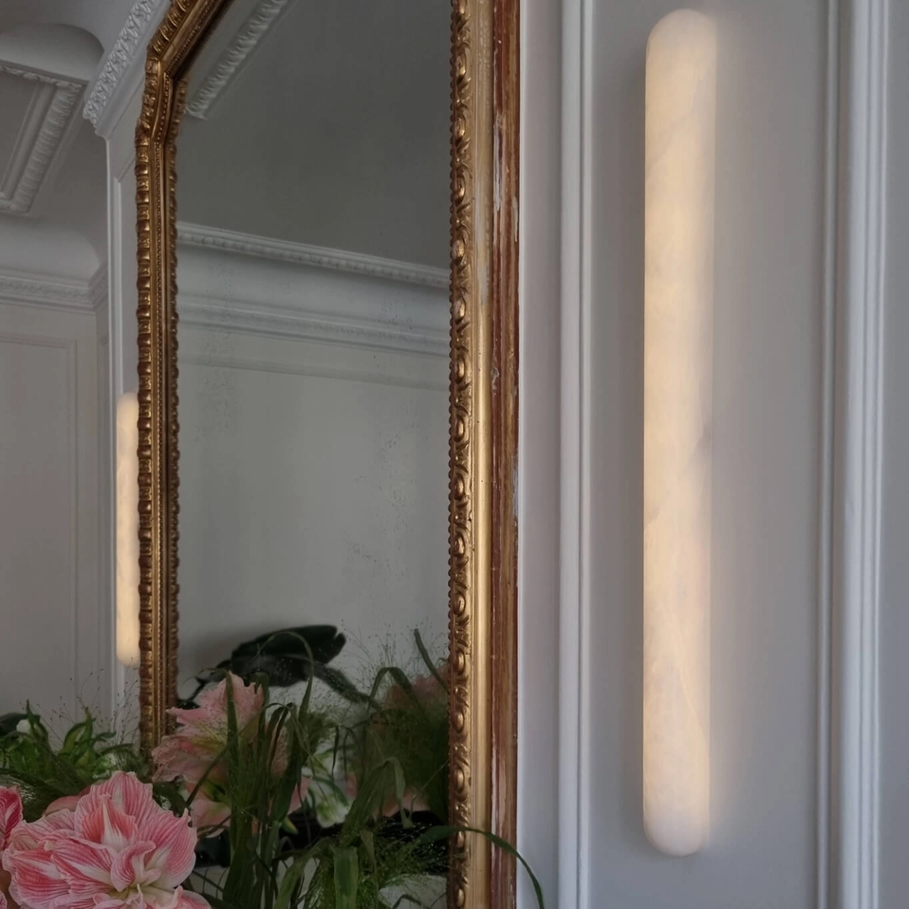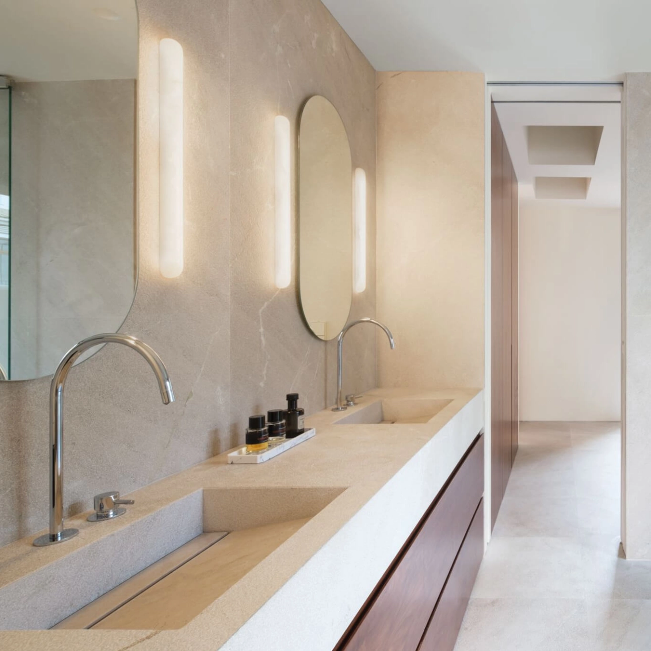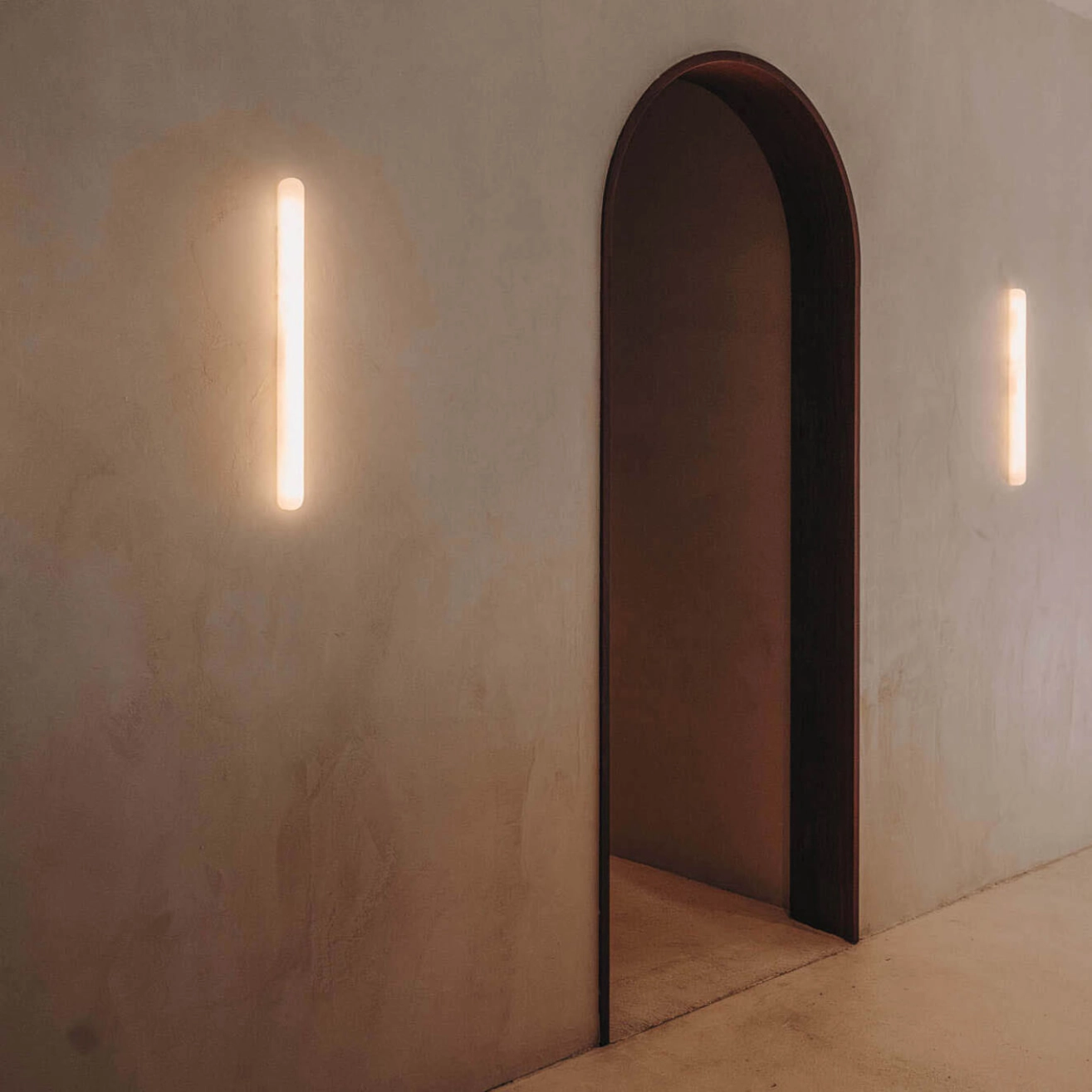 Élancée et architecturale, l’applique Tub 45 Alabaster affirme une présence lumineuse à la fois discrète et sculpturale. Conçue par le studio espagnol Contain, fondé à Majorque par Mauricio Obarrio et Juan Peralta, cette pièce illustre parfaitement la recherche d’équilibre entre matière naturelle et géométrie essentielle. Réalisée en albâtre, pierre noble appréciée pour sa translucidité, la Tub 45 diffuse une lumière douce et homogène qui enveloppe le mur d’un halo chaleureux. Chaque applique est unique : les veinures naturelles peuvent être mises en valeur pour souligner le caractère organique de la pierre, ou sélectionnées dans une version plus blanche et uniforme pour un rendu minimaliste et contemporain. Avec son format vertical de 45 cm, la Tub 45 structure l’espace avec élégance, que ce soit dans un couloir, en tête de lit ou dans un projet hôtelier haut de gamme. Plus qu’un simple luminaire, la Tub 45 Alabaster incarne la philosophie de Contain : sublimer la lumière à travers la pureté des lignes et l’authenticité des matériaux.