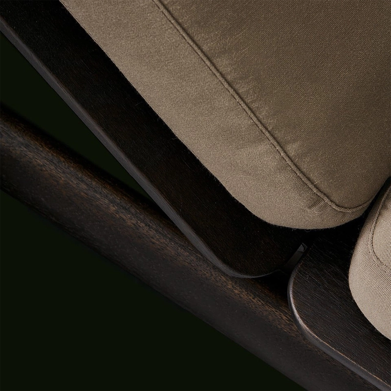 structure en bois massif et métal verni, assise et pré-revêtement en polyester et finition tissu