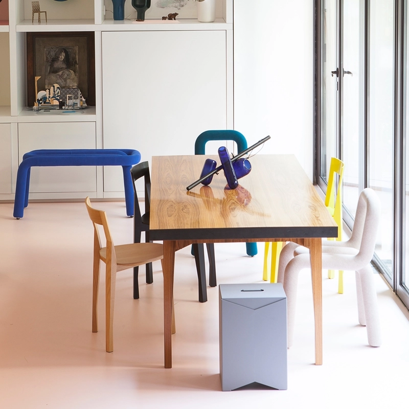 Le banc Bold est la déclinaison de la chaise du même nom, dessinée par Big-Game pour l'éditeur Moustache. Ce petit banc très graphique est composé de deux parties tubulaires en métal imbriquées l'une dans l'autre. La série Bold réactualise ainsi la tradition du siège en tube d'acier. Gonflée d'une épaisse mousse de polyuréthane, la ligne tracée par Bold joue le rôle à la fois de pieds et de siège tout en apportant le confort. Le banc de Moustache est recouvert d'un gainage de textile déhoussable qui se décline en plusieurs coloris. Il apporte une touche graphique étonnante dans une chambre d'enfant ou dans l'entrée.