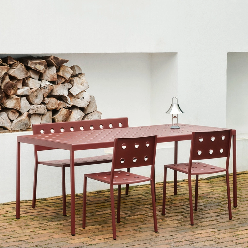 Balcony est une collection de mobilier pour extérieur conçue par les designers Ronan et Erwan Bouroullec pour la marque Hay. Le design carré est adouci par les trous et les bords arrondis, qui donnent non seulement à la collection une expression distinctive, mais aussi renforcent la construction. Le banc Balcony Dining est réalisé en acier revêtu de poudre qui reçoit en plus un traitement contre la corrosion. Cette double finition permet une résistance et une durabilité optimale. Décliné en plusieurs couleurs, le banc Balcony Dining est parfaitement adapté aux jardins et autres espaces extérieurs.