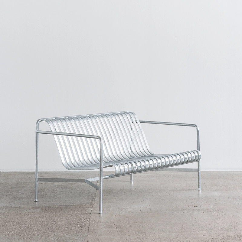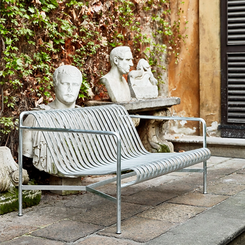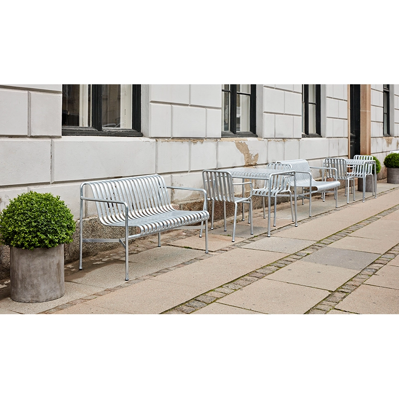 Palissade est une collection de mobilier d'extérieur dessinée par Ronan et Erwan Bouroullec pour la marque Hay. La série est composée d'une large gamme de mobilier, dans laquelle toutes les pièces partagent le même principe de conception. Palissade comprend des chaises, petits fauteuils, fauteuils lounge, tabourets, tables et bancs à l'exemple du banc avec dossier Palissade L128. Spécialement conçues pour un usage extérieur, ces pièces sont visuellement légères mais robustes dans leur réalisation. Inspirée par des meubles classiques, la collection Palissade signée Hay trouve son originalité dans les détails. Bien que conçus en acier, ces meubles outdoor sont confortables simplement grâce à leur design. Chaque pièce est disponible en vert olive, gris clair ou anthracite et s'intègre très bien dans un environnement naturel ou urbain. Avec Palissade, les frères Bouroullec ont imaginé une collection de mobilier outdoor durable qui s'associe facilement à tous les styles : un futur Classique du design !
