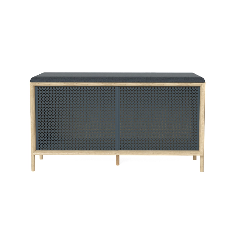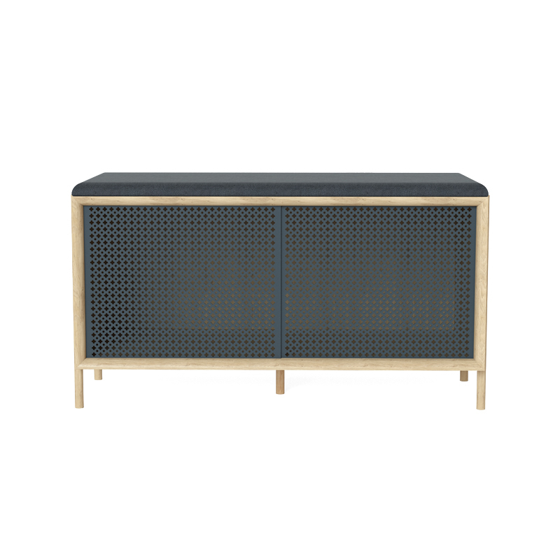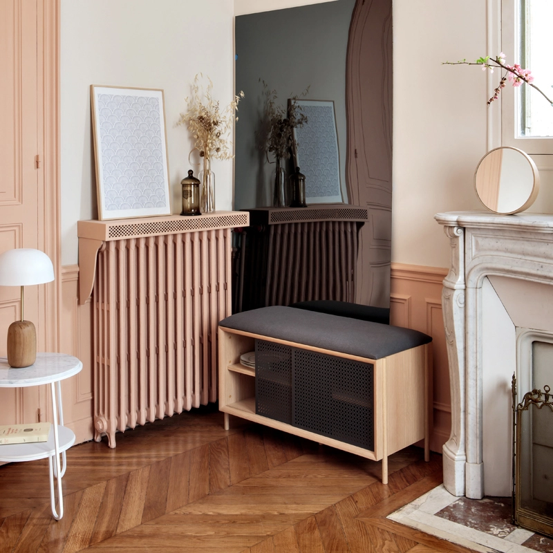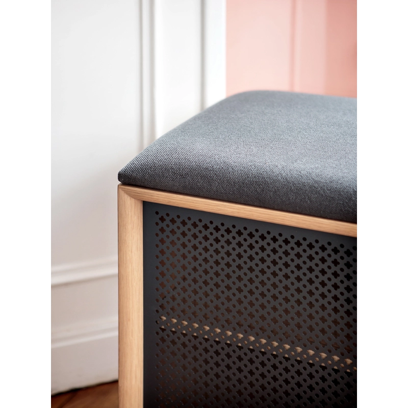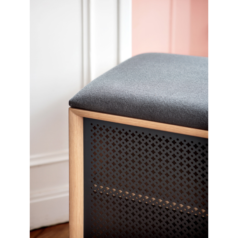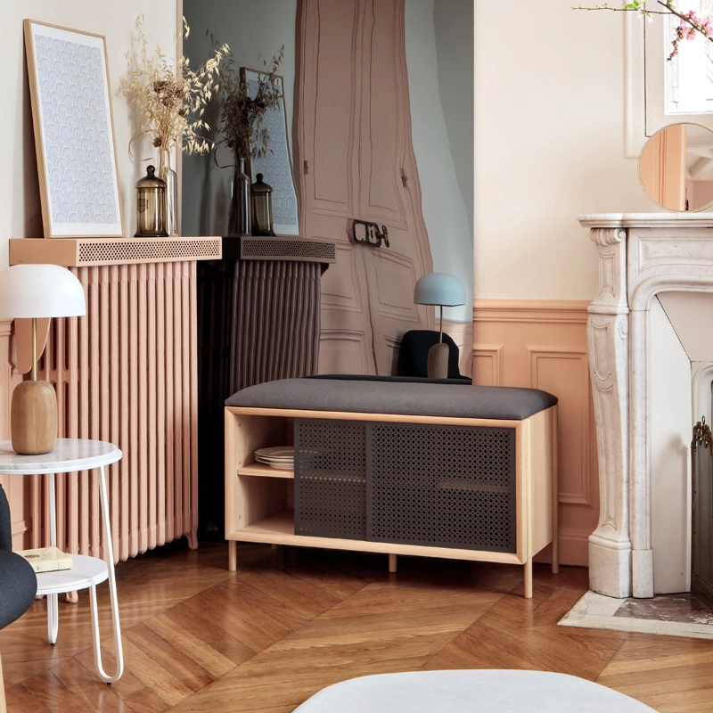 Dessinée par Mathieu Galard, directeur artistique d’Hartô, ce banc d’entrée vient enrichir la collection de rangement Gabin. A l’image des pièces de la collection du même nom, il est empreint de modernité. Gabin se démarque par ses portes coulissantes inspirées du cannage et l'association du bois et du métal. Le design de la structure a été pensé avec simplicité et rondeur, créant une harmonie entre la fonction et l'esthétique. Avec ses proportions réduite, le banc d'entrée Gabin apporte sa touche créative dans tous types d’entrées. Vous pourrez y déposer un sac, vous assoir, ou y ranger vos chaussures. Gabin est livré avec un coussin d’assise.