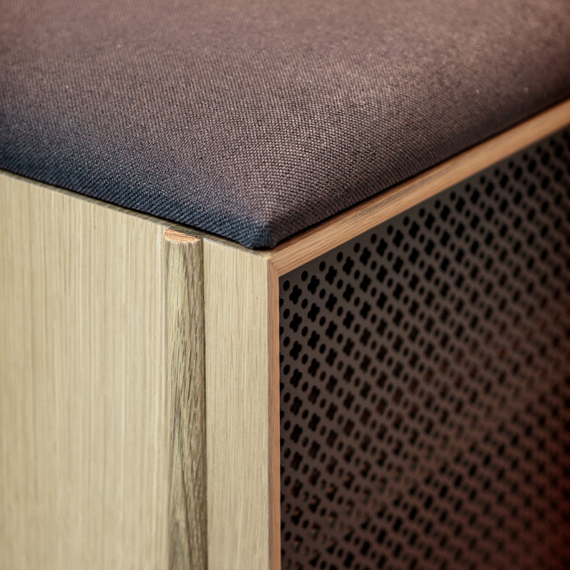 mdf plaqué chêne, métal laqué mat, assise mouse pu et tissu