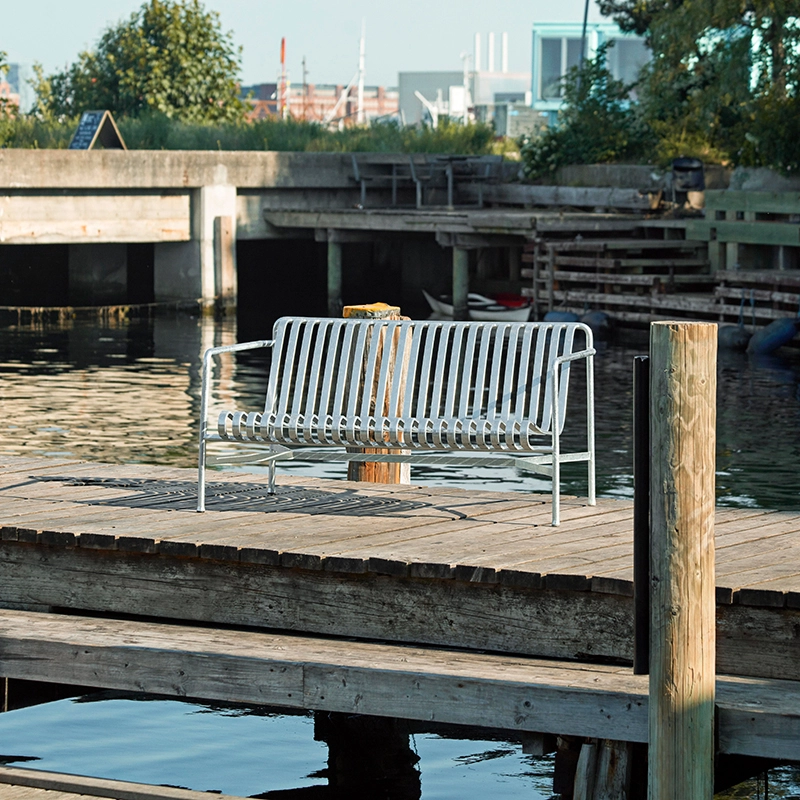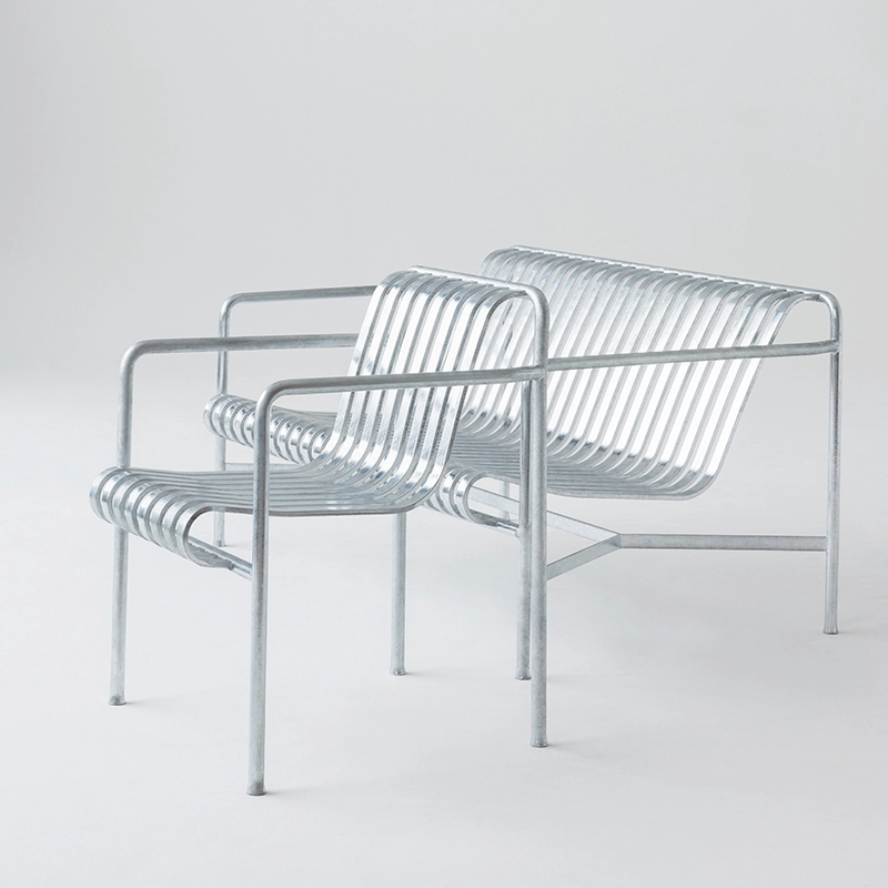 collection Palissade comprend des chaises, petits fauteuils, fauteuils lounge, tabourets, tables et bancs à l'exemple du