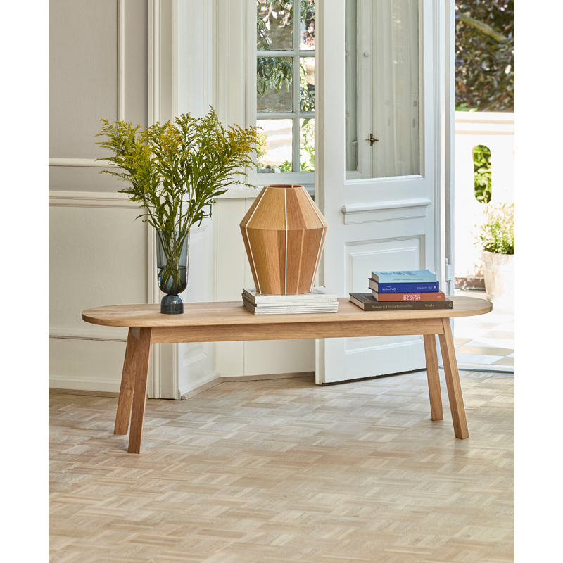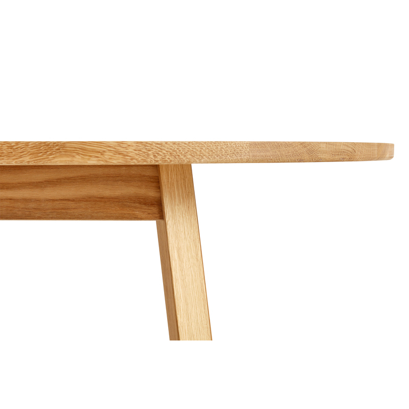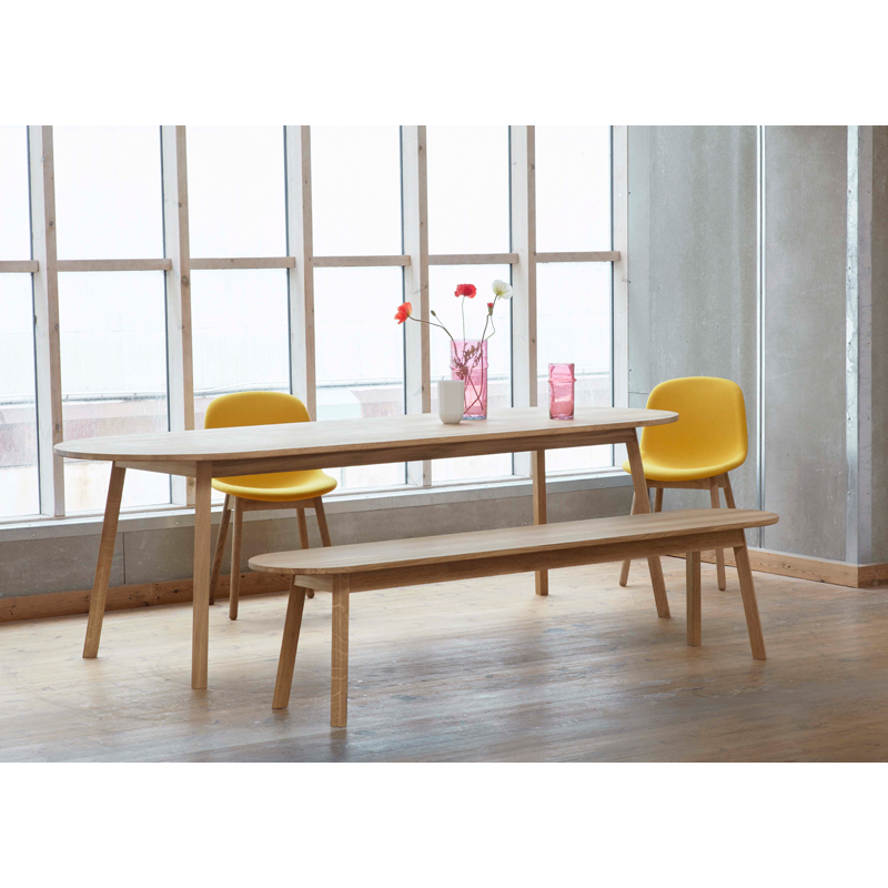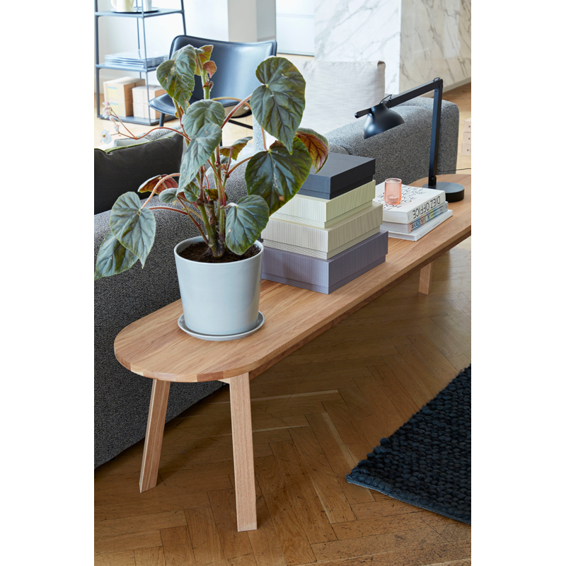Motivé par le désir de créer plus d'espace autour d'une table circulaire, Simon Jones a conçu la série de tables et bancs Triangle pour Hay. Les extrémités rectangulaires de la table et du banc ont été arrondies pour maximiser le nombre de sièges autour de la table. Fabriquée en chêne massif avec une finition huilée, la série polyvalente Triangle Leg convient à un large éventail d'environnements de salle à manger ou de bureau privés et publics.
