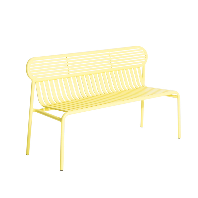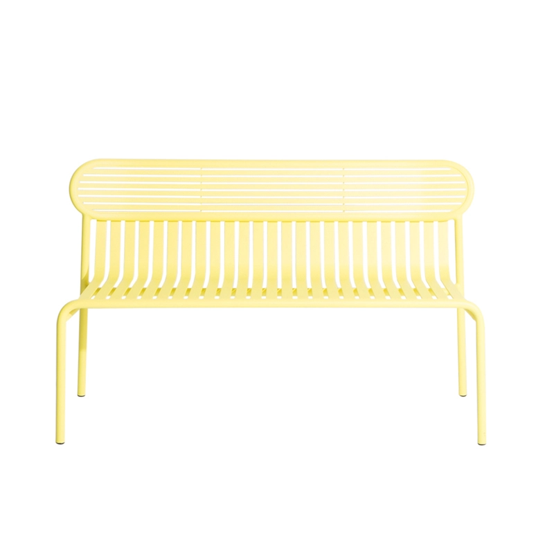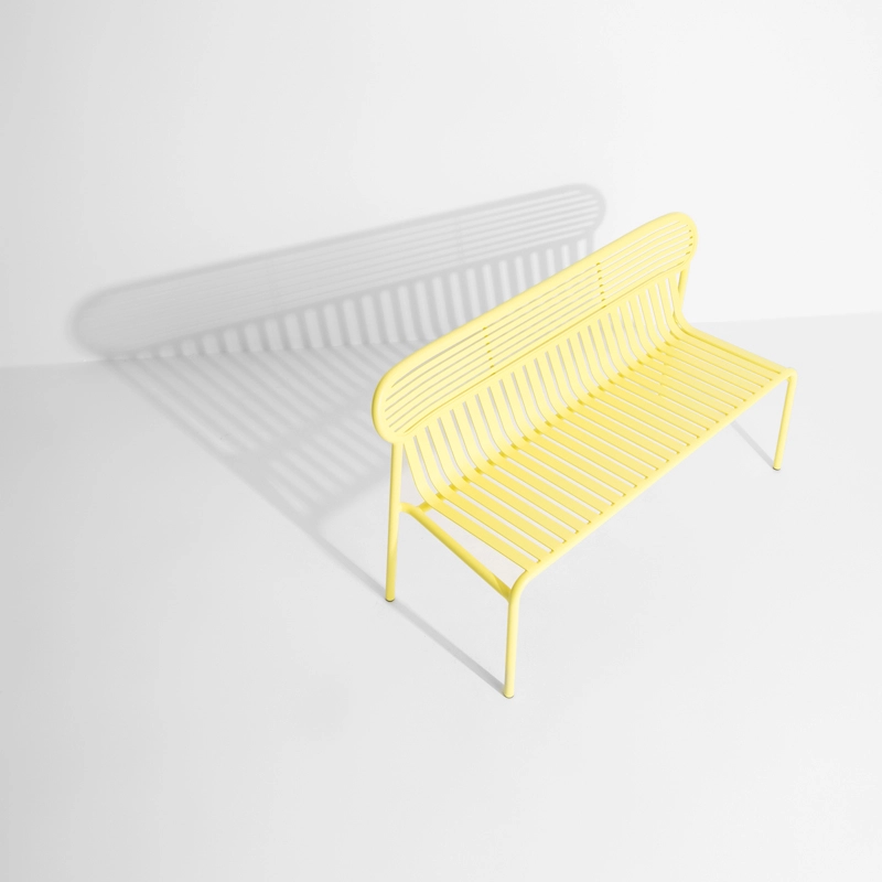 Avec Week-End, la marque française Petite Friture, pose son regard singulier sur l’été et propose avec le studio Brichet-Ziegler une approche graphique et contemporaine du mobilier de jardin. Celle-ci se joue d’un rythme de bandes horizontales et verticales posées avec habileté sur une structure aux lignes fortes. Les bandes de ce banc qui caractérisent la collection Week-End éditée par Petite Friture, sont réalisées dans des feuilles d’aluminium découpées au laser en une seule pièce et non en lattes assemblées, permettent la suppression de vis ou de soudures inconfortables. Le travail des lattes comme des rayures, souligne les pleins et les vides, affirmant l’identité de la collection. La collection Week-End est une gamme de mobilier outdoor complète. Les couleurs précises sélectionnées pour cette collection marquent seules ou en combinaison les lignes d’horizon d’un balcon, d’une terrasse ou d’un jardin. Ce banc est disponible en plusieurs couleurs comme le noir, jaune, vert jade … La mise en couleurs de la collection Week-end, de Petite Friture, en peinture poudre époxy anti-UV grainée garantit un maintien impeccable des teintes au cours du temps. Le banc design proposée par Petite Friture, a été conçu avec l’obsession de tirer le meilleur parti des matériaux et des techniques de réalisation à la disposition des designers. Réalisée en aluminium, matériau sélectionné pour sa légèreté et sa résistance aux intempéries, la collection Week-End allie confort esthétique et sens pratique. En effet, cette collection est résolument pensée autour d’une utilisation pratique car toutes les assises sont empilables.