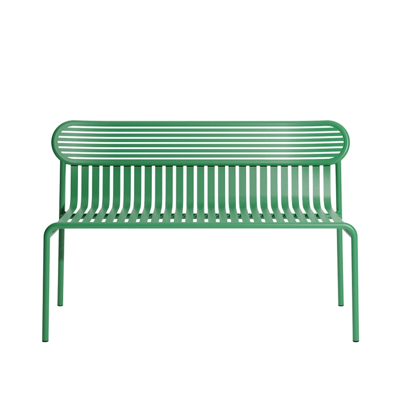 Avec Week-End, la marque française Petite Friture, pose son regard singulier sur l’été et propose avec le studio Brichet-Ziegler une approche graphique et contemporaine du mobilier de jardin. Celle-ci se joue d’un rythme de bandes horizontales et verticales posées avec habileté sur une structure aux lignes fortes. Les bandes de ce banc qui caractérisent la collection Week-End éditée par Petite Friture, sont réalisées dans des feuilles d’aluminium découpées au laser en une seule pièce et non en lattes assemblées, permettent la suppression de vis ou de soudures inconfortables. Le travail des lattes comme des rayures, souligne les pleins et les vides, affirmant l’identité de la collection. La collection Week-End est une gamme de mobilier outdoor complète. Les couleurs précises sélectionnées pour cette collection marquent seules ou en combinaison les lignes d’horizon d’un balcon, d’une terrasse ou d’un jardin. Ce banc est disponible en plusieurs couleurs comme le noir, jaune, vert jade … La mise en couleurs de la collection Week-end, de Petite Friture, en peinture poudre époxy anti-UV grainée garantit un maintien impeccable des teintes au cours du temps. Le banc design proposée par Petite Friture, a été conçu avec l’obsession de tirer le meilleur parti des matériaux et des techniques de réalisation à la disposition des designers. Réalisée en aluminium, matériau sélectionné pour sa légèreté et sa résistance aux intempéries, la collection Week-End allie confort esthétique et sens pratique. En effet, cette collection est résolument pensée autour d’une utilisation pratique car toutes les assises sont empilables.