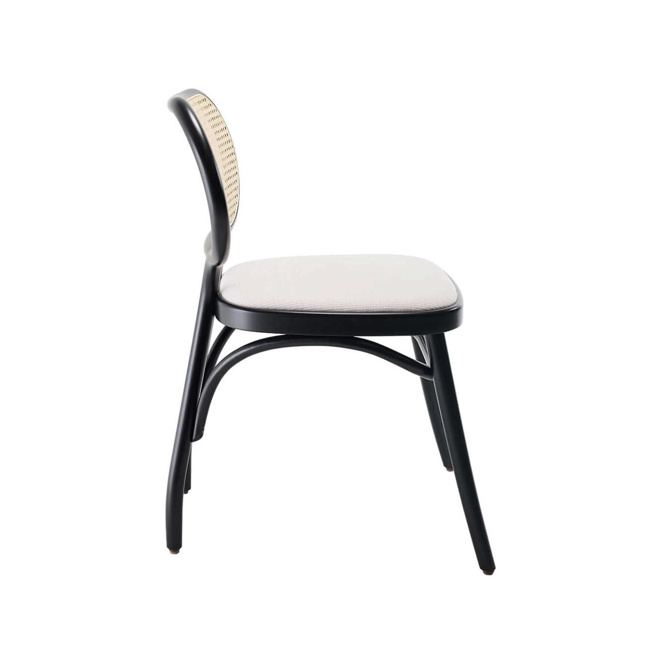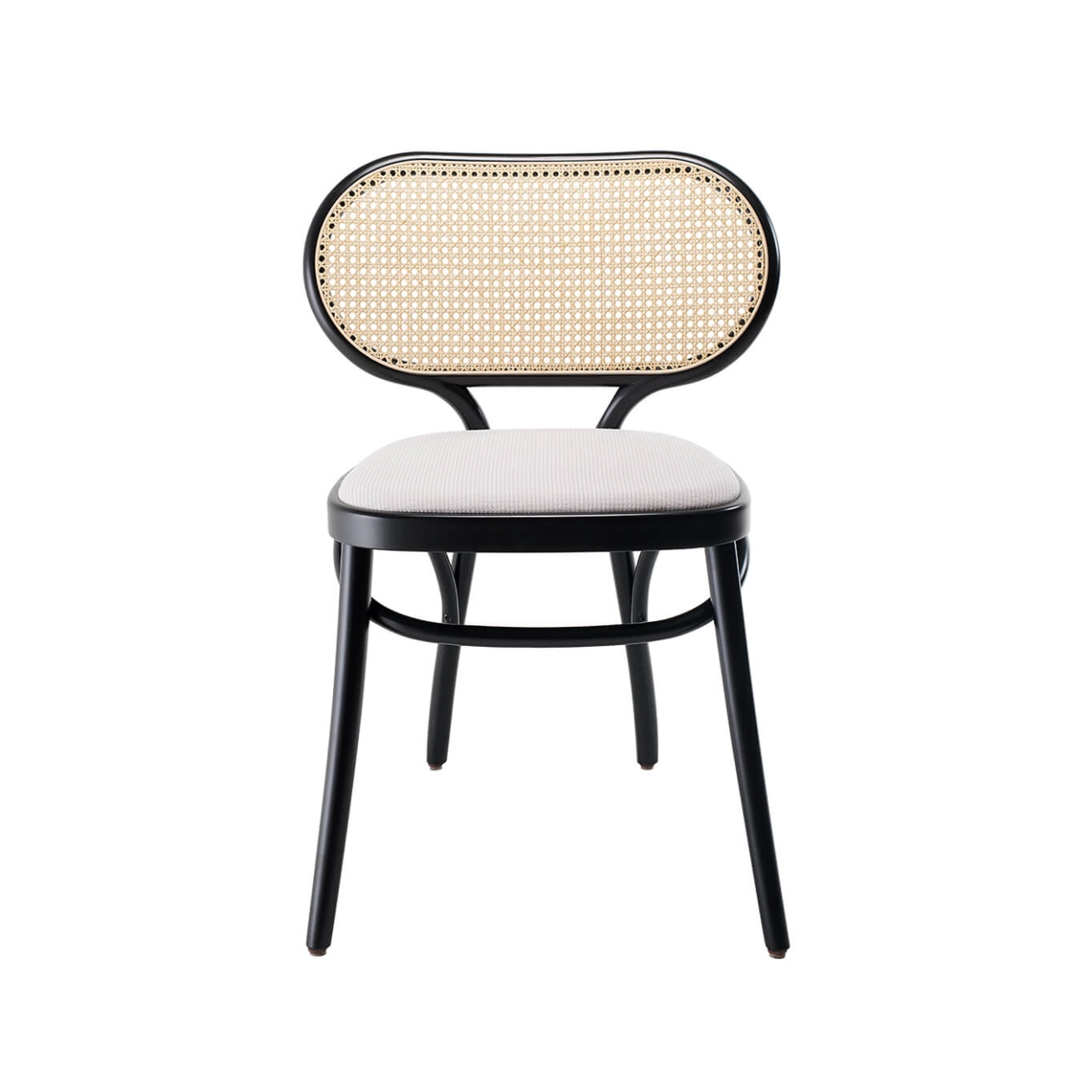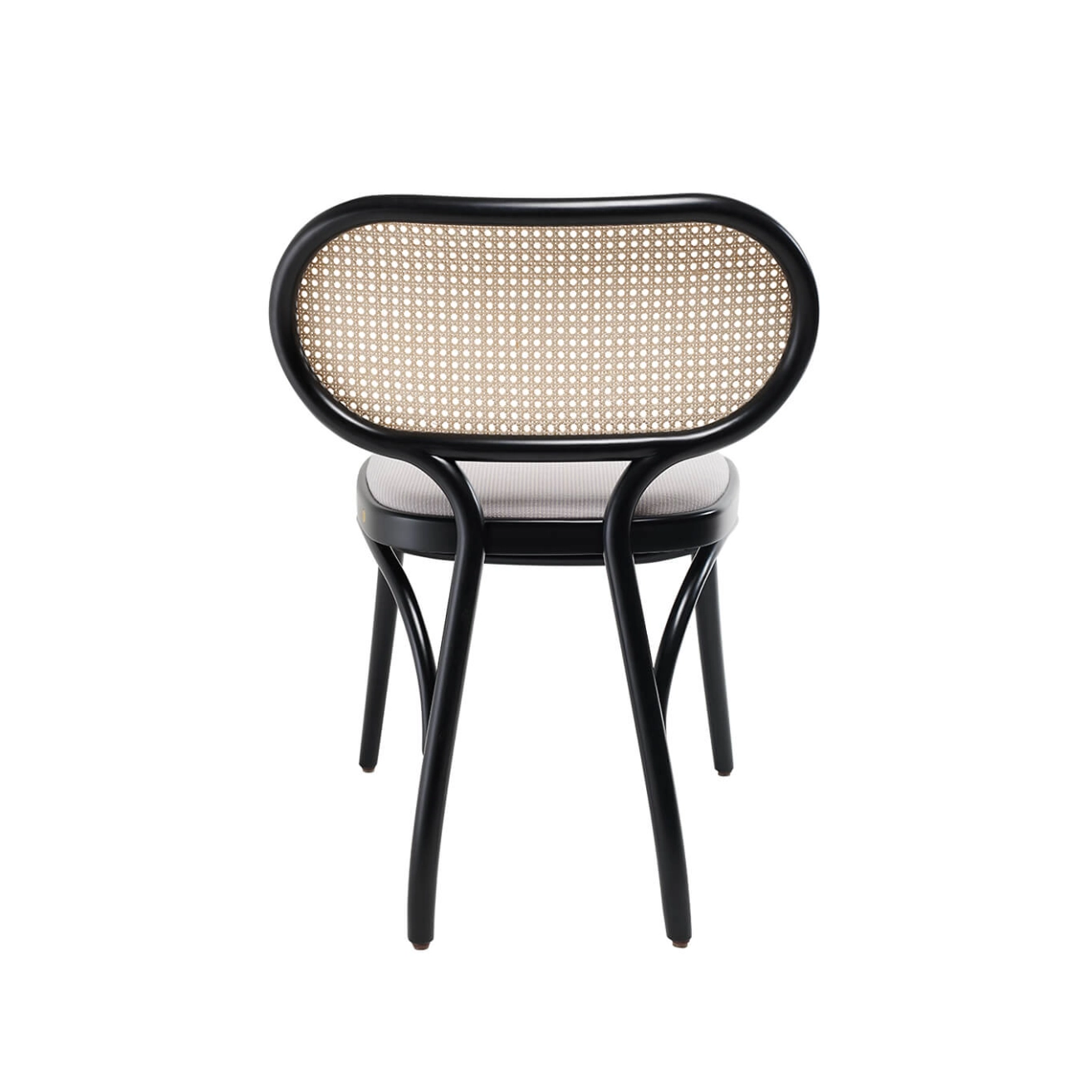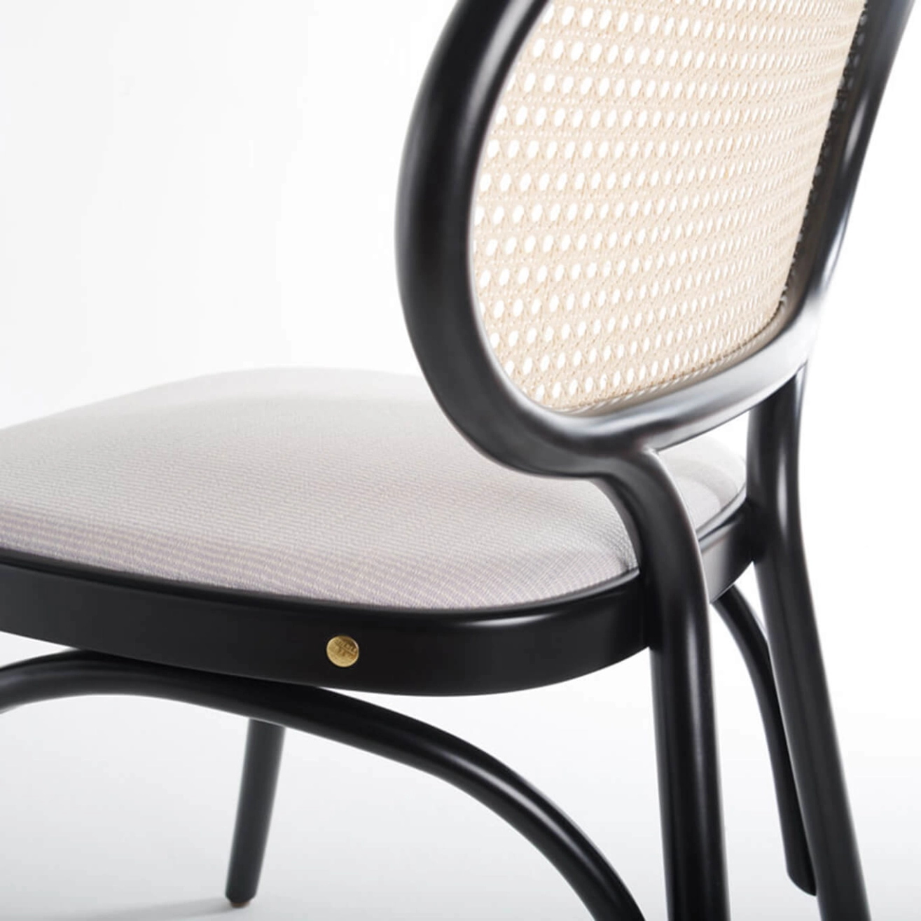 Hêtre cintré laqué, assise rembourrée, revêtement tissu Fuse, dossier en paille de Vienne
