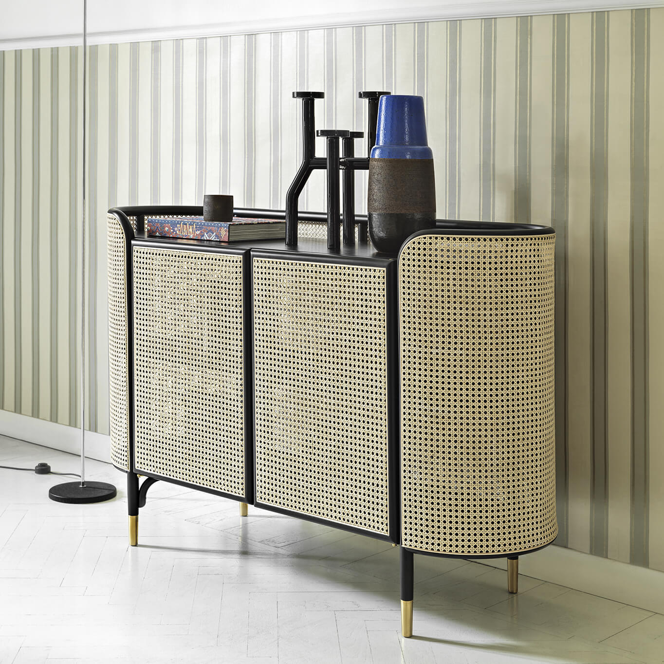 Hêtre cintré laqué, inserts latéraux en paille de Vienne, étagères en plaqué frêne teinté à pores ouverts, pieds laiton