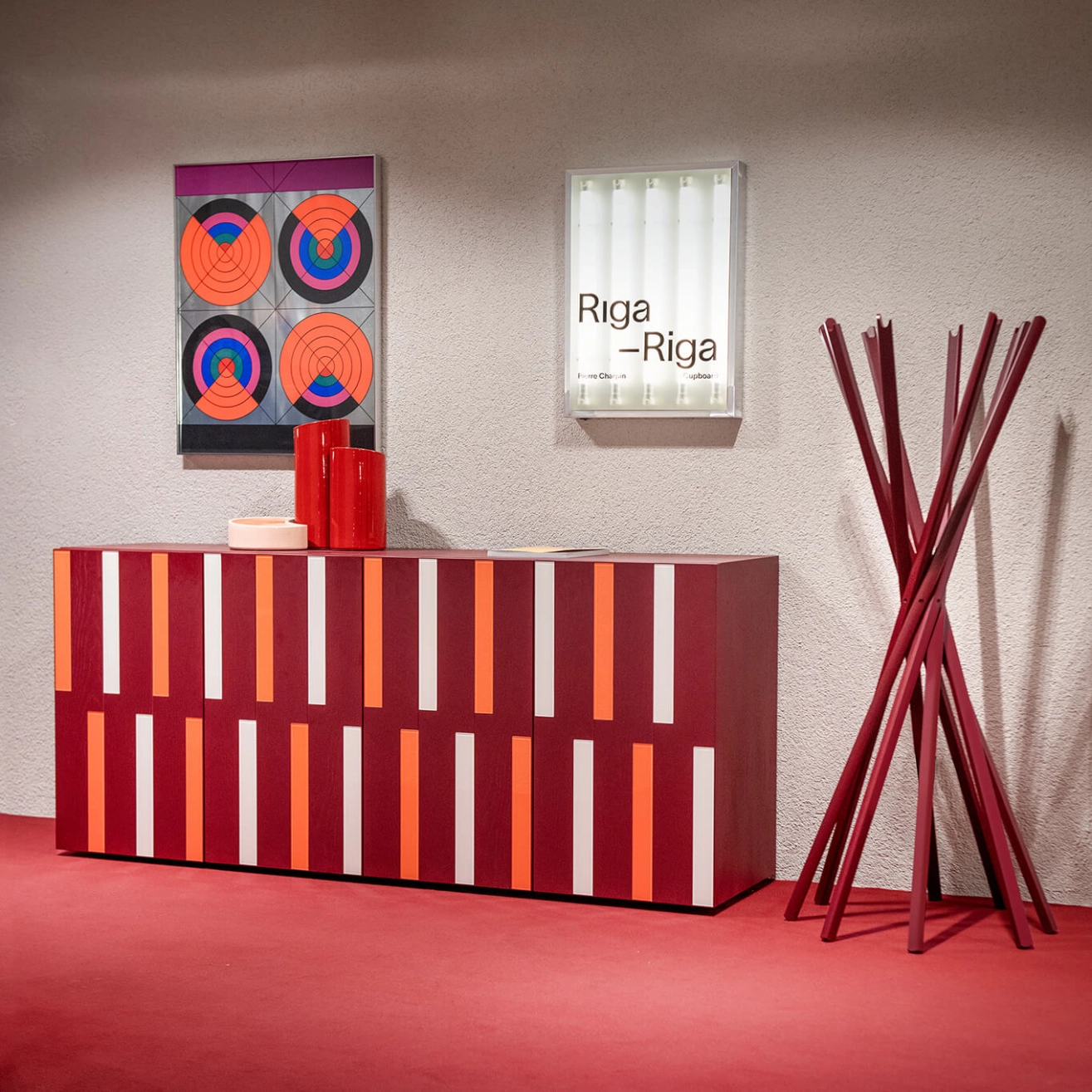Fruit d'une collaboration avec le designer et artiste français Pierre Charpin et Zanotta, Riga-Riga est une collection comprenant des tables et des rangements sculpturaux. Le rangement Riga-Riga se distingue par un motif incrusté de verre artisanal coloré. Le contraste entre le bois de frêne et les éléments en verre coloré poli crée un rythme et un aspect tridimensionnel, positionnant la collection Riga-Riga dans un univers artistique.