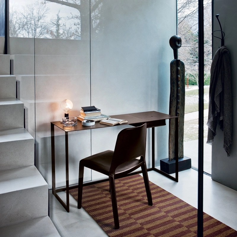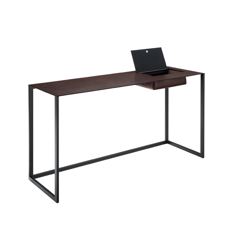 La collection 2013 de Zanotta inclut un bureau dessiné par le jeune designer Gabriele Rosa. Calamo est un petit bureau élégant peu profond, permettant de créer un espace de travail dans un petit espace de vie. C'est à la fois une table d'écriture et une console qui s'intègre dans tous les salons, contre un mur ou derrière un canapé. La structure et le plateau sont réalisés en acier verni. Un cuir sellier recouvre entièrement le plateau et forme le porte-objet. L'élément de rangement est accessible par une ouverture à bascule découpée directement dans le plateau.