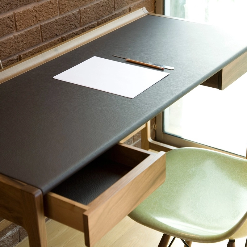 Cedric Desk est réalisé en noyer Européen et gainé de cuir marron foncé sur le plateau et à l'intérieur des tiroirs.