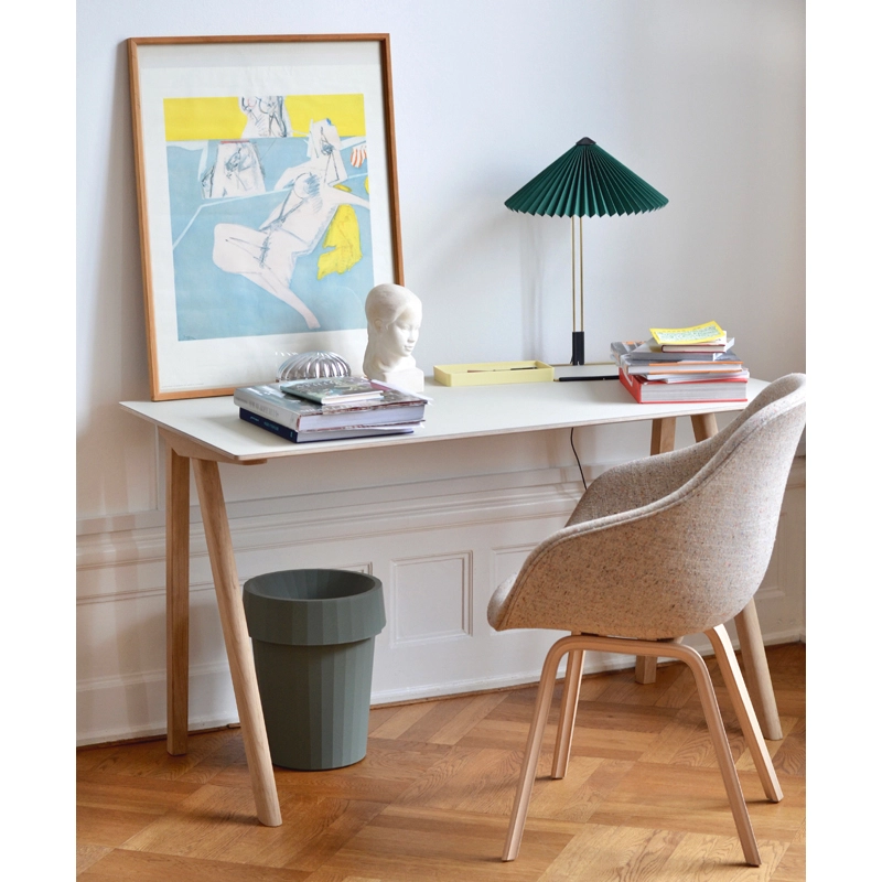 Pour la collection Copenhague, la maison d'édition Hay a invité les designers français Ronan et Erwan Bouroullec à dessiner une gamme de mobilier pour l'Université de Copenhague. Les designers se sont inspirés d'une chaise d'université dessinée par l'architecte Bernt Pedersen, à l'identité simple. La série Copenhague cherche à maintenir la simplicité évidente qui marque cette chaise reprenant le piètement tréteau, tout en créant une gamme de mobilier scolaire qui s'inscrit dans notre époque et s'adapte aux besoins fonctionnels d'une université. La collection s'éloigne un peu de l'esprit institutionnel de la chaise de départ par son originalité et ses formes. Le petit bureau Copenhague Desk 90 est composé d'un plateau en chêne recouvert de lino, fixé sur un piètement tréteau en chêne massif. Ce bureau domestique est idéal pour les petits espaces ou pour la chambre.