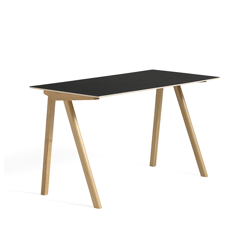 Pour la collection Copenhague, la maison d'édition Hay a invité les designers français Ronan et Erwan Bouroullec à dessiner une gamme de mobilier pour l'Université de Copenhague. Les designers se sont inspirés d'une chaise d'université dessinée par l'architecte Bernt Pedersen, à l'identité simple. La série Copenhague cherche à maintenir la simplicité évidente qui marque cette chaise reprenant le piètement tréteau, tout en créant une gamme de mobilier scolaire qui s'inscrit dans notre époque et s'adapte aux besoins fonctionnels d'une université. La collection s'éloigne un peu de l'esprit institutionnel de la chaise de départ par son originalité et ses formes. Le petit bureau Copenhague Desk 90 est composé d'un plateau en chêne recouvert de lino, fixé sur un piètement tréteau en chêne massif. Ce bureau domestique est idéal pour les petits espaces ou pour la chambre.