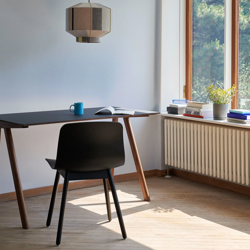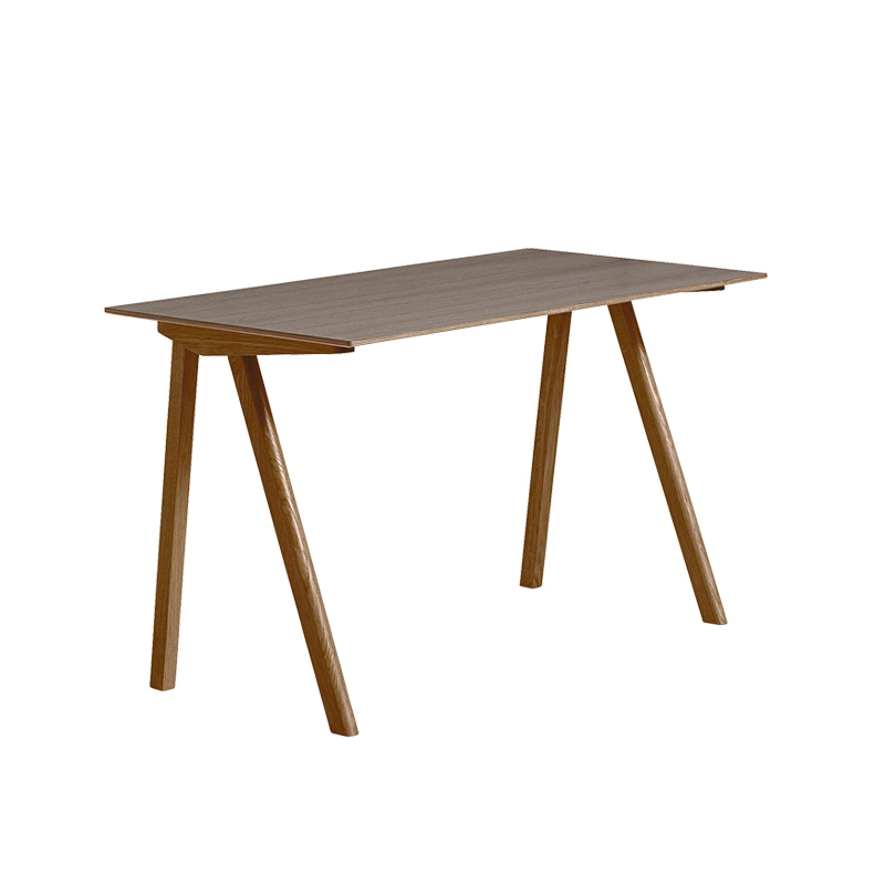 Pour la collection Copenhague, la maison d'édition Hay a invité les designers français Ronan et Erwan Bouroullec à dessiner une gamme de mobilier pour l'Université de Copenhague. Les designers se sont inspirés d'une chaise d'université dessinée par l'architecte Bernt Pedersen, à l'identité simple. La série Copenhague cherche à maintenir la simplicité évidente qui marque cette chaise reprenant le piètement tréteau, tout en créant une gamme de mobilier scolaire qui s'inscrit dans notre époque et s'adapte aux besoins fonctionnels d'une université. La collection s'éloigne un peu de l'esprit institutionnel de la chaise de départ par son originalité et ses formes. Le petit bureau Copenhague Desk 90 est composé d'un plateau en chêne recouvert de lino, fixé sur un piètement tréteau en chêne massif. Ce bureau domestique est idéal pour les petits espaces ou pour la chambre.