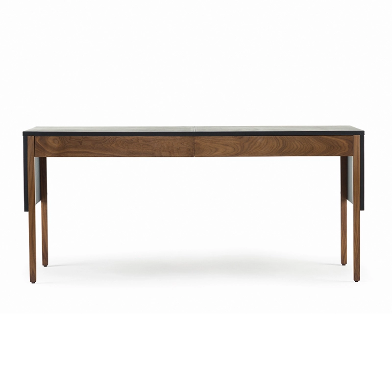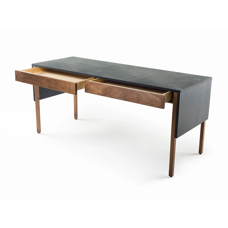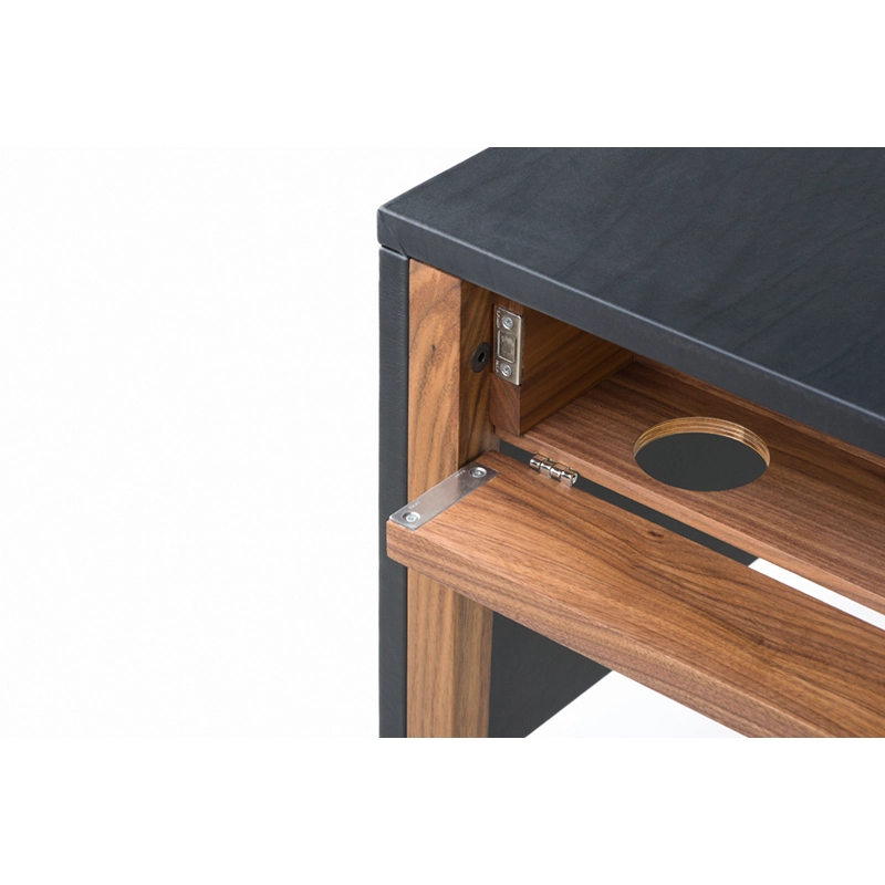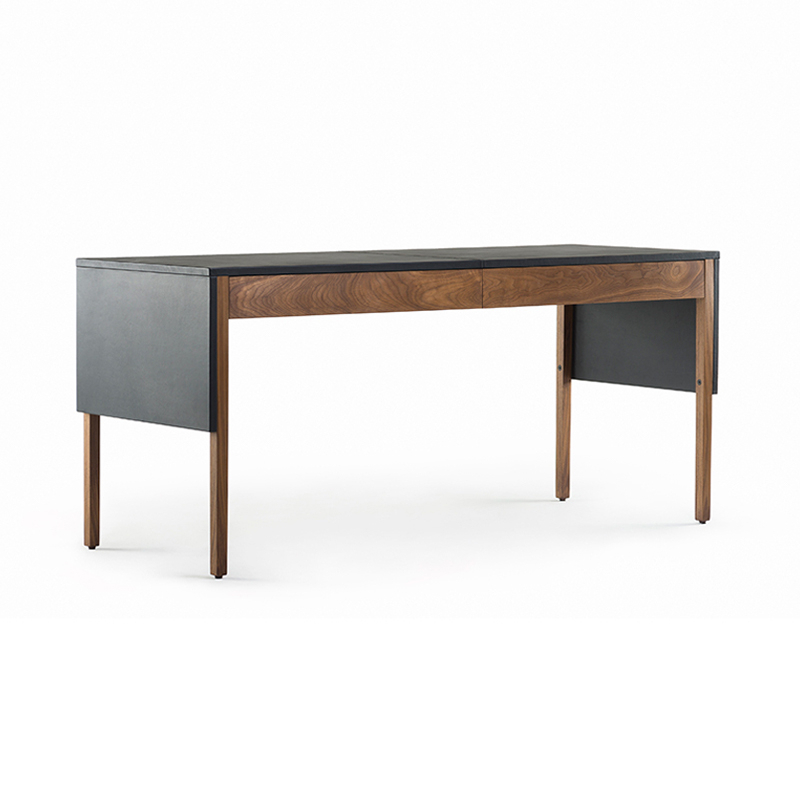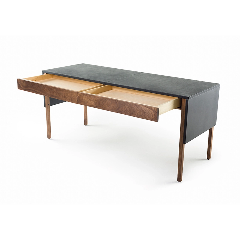 Le bureau Drape signé Neri & Hu pour De La Espada offre une expression visuelle grâce à une conception réfléchie : le dessus de table gainé de cuir est articulé comme un « drapé » qui tombe sur les pieds de la table, donnant une impression de continuité à la silhouette. Deux tiroirs nichés en dessous courent le long de la table pour un grand espace de rangement. Au dos, une porte rabattable révèle la gestion des câbles.