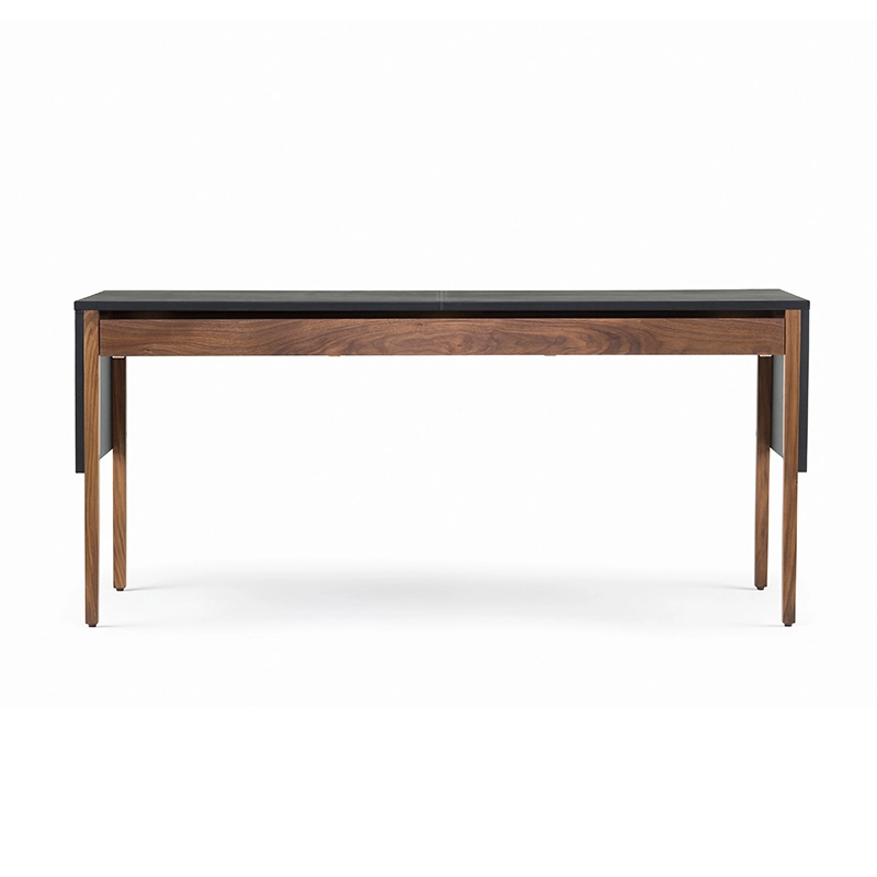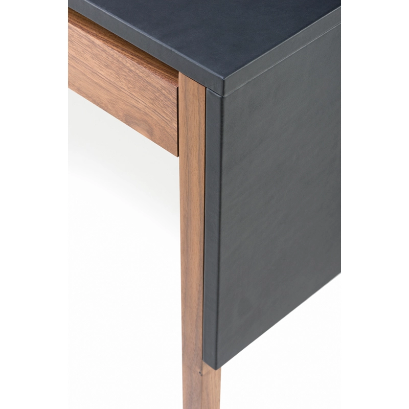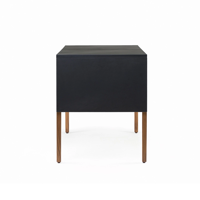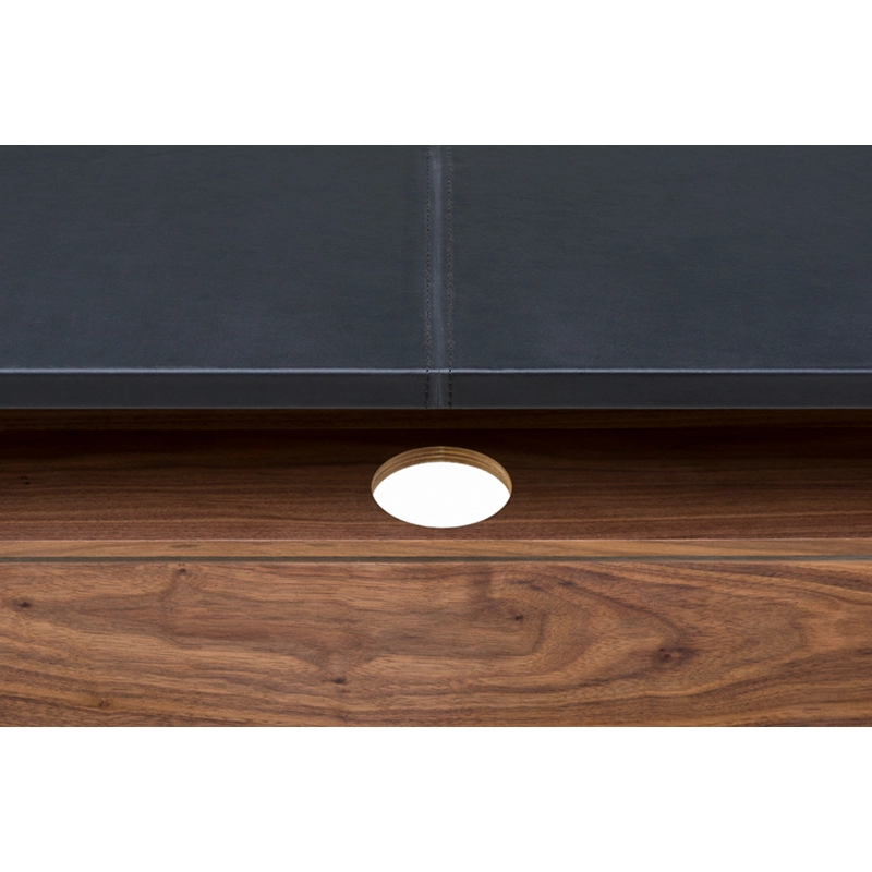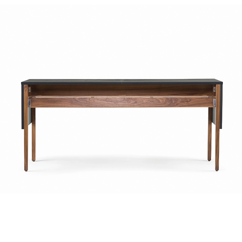 Le bureau Drape signé Neri & Hu pour De La Espada offre une expression visuelle grâce à une conception réfléchie : le dessus de table gainé de cuir est articulé comme un « drapé » qui tombe sur les pieds de la table, donnant une impression de continuité à la silhouette. Deux tiroirs nichés en dessous courent le long de la table pour un grand espace de rangement. Au dos, une porte rabattable révèle la gestion des câbles.