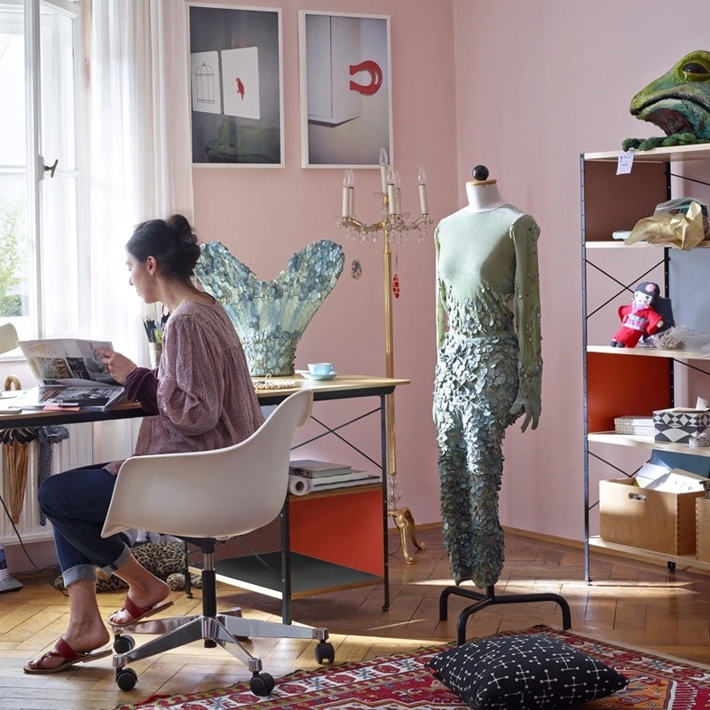 En 1949, Charles et Ray Eames créèrent un nouveau système d'étagères et de bureaux multifonctionnels qui reprenait le principe de construction et d'aménagement de leur maison et dont la structure se fondait strictement sur les principes de la production en série. Eames Desk Unit est un petit bureau a l'aspect industriel intemporel. Edité par Vitra, les éléments en acier sont réchauffés pas les panneaux en bois laqué. Avec ses dimensions restreintes, c'est le bureau d'appartement idéal dans une chambre ou une bibliothèque.