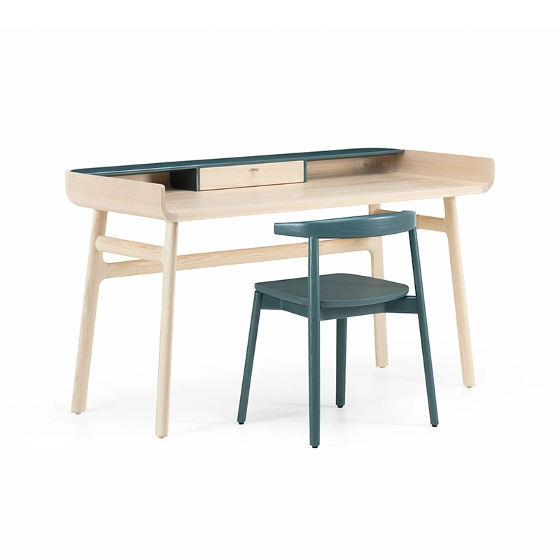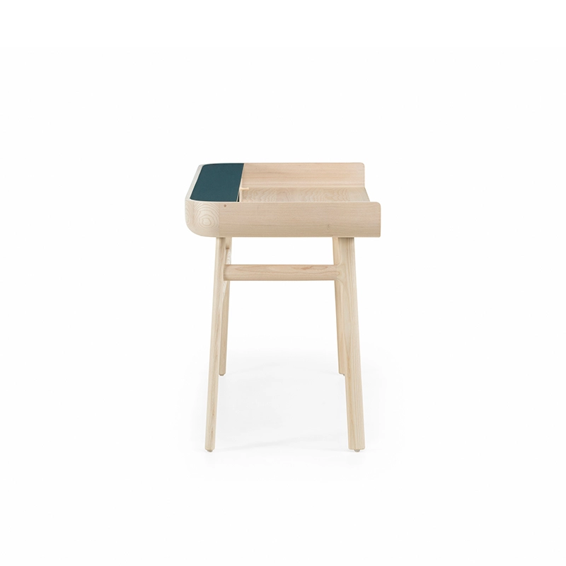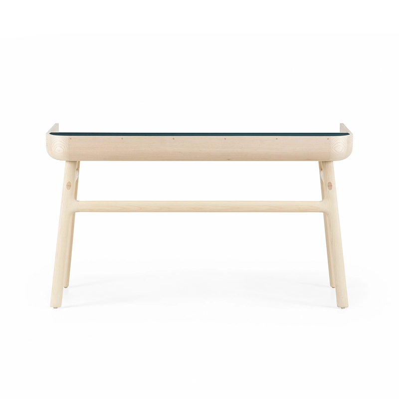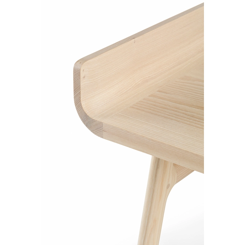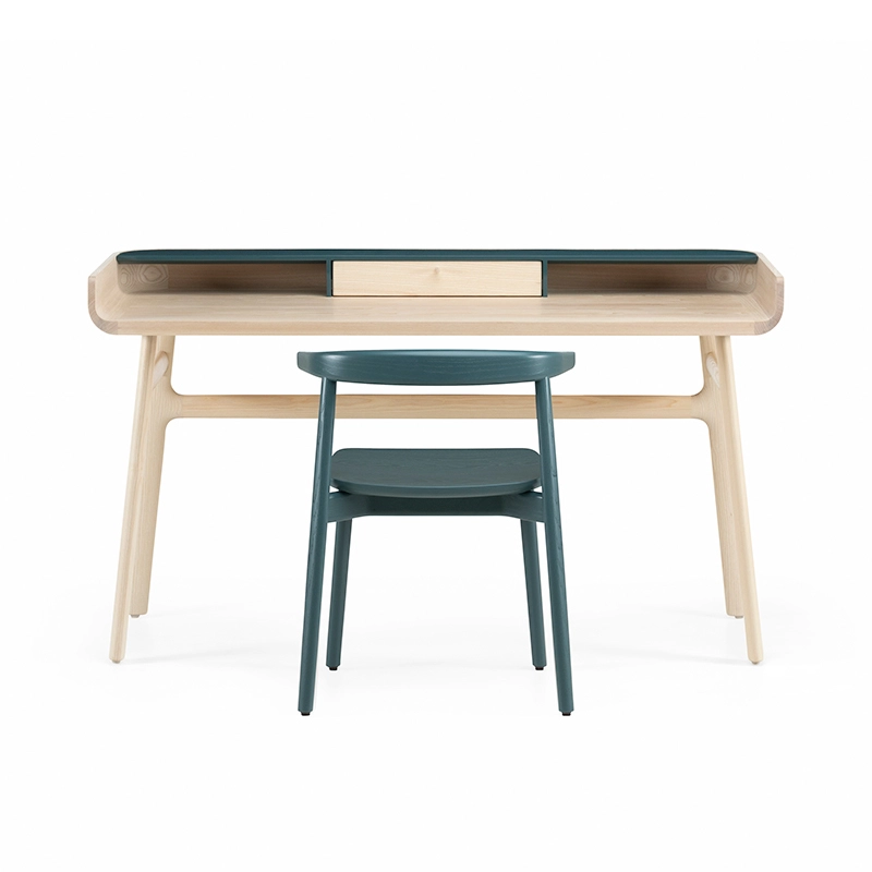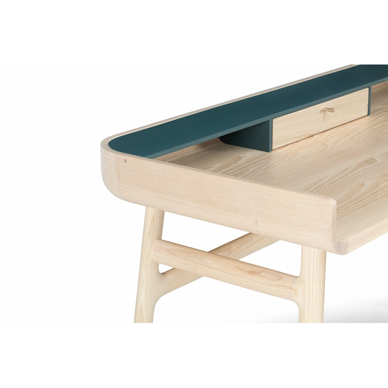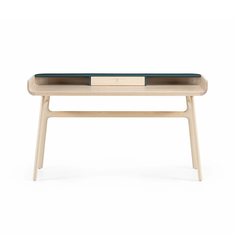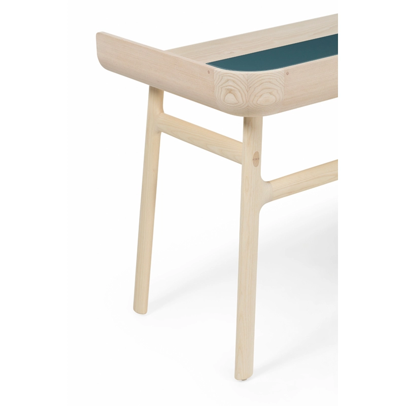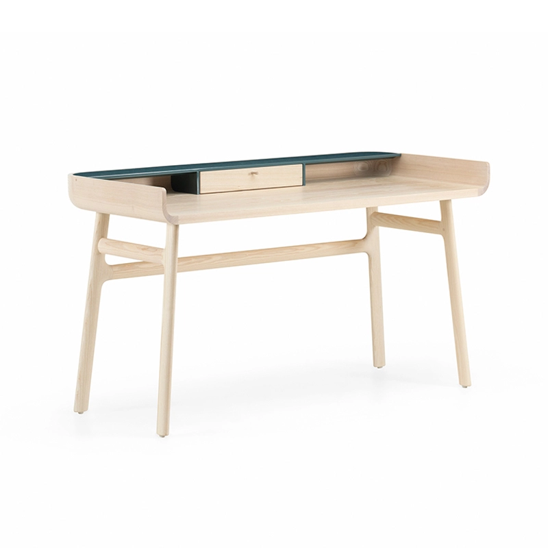 Fabriqué en bois avec des touches de laque, Harold est un bureau d'écriture classique doté d'un tiroir de table et d'espaces de rangement ouverts. Les courbes vers le haut sur les côtés du plateau sont usinées à partir de généreuses planches de bois de première qualité. Les pieds minces à cadre en H reliés par des tenons en coin offrent une légèreté visuelle au bureau Harold.