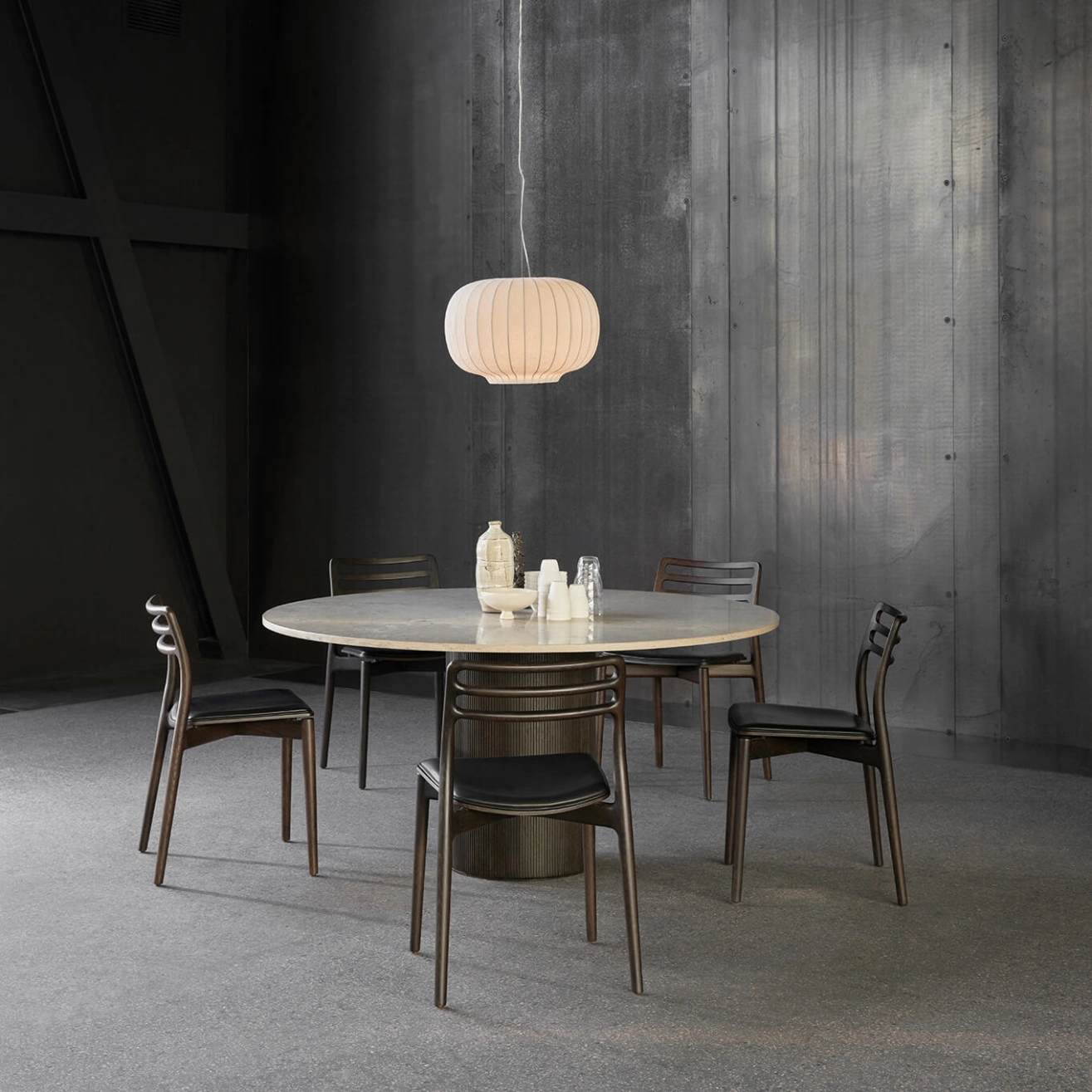 La table Cabin Round est une table aux dimensions variées, disponible en Ø130 et Ø150, conçue par Vipp pour votre salle à manger ou votre cuisine. Cette table se distingue par sa base en chêne massif laqué, disponible en chêne clair ou foncé, et son plateau en marbre. Que ce soit avec une base en métal ou en bois, chaque produit Vipp reflète un raffinement et une attention particulière aux détails. La table Cabin Round ne fait pas exception, avec ses subtiles finitions en bois pour la base et ses bords ronds et sablés du plateau. Chez Vipp, le calcaire et le marbre sont des matériaux récurrents dans nos conceptions de mobilier. L'expression visuelle de ces pierres naturelles raconte l’histoire de millions d'années de transformation géologique. Les veines, fossiles et nuances de couleur résultent de conditions géologiques particulières, garantissant que chaque pierre est unique. Cette singularité est l'une des caractéristiques qui fait de chaque table Cabin Round un produit inimitable de Vipp.