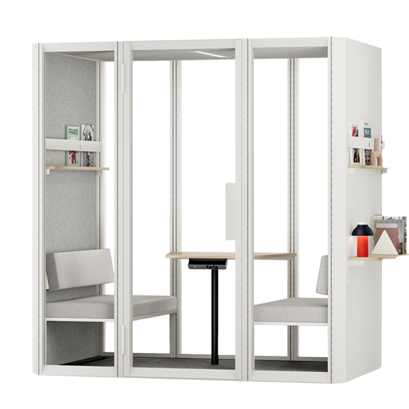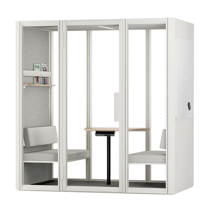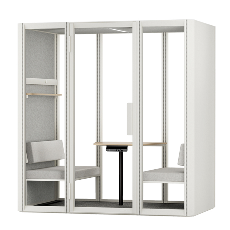 La cabine acoustique Jetson L4 est conçue pour accueillir jusqu'à 4 personnes. Elle est équipée de deux canapés avec dossiers réglables en hauteur, d'une table en mélaminé, d'une étagère étroite avec un rail d'exposition et un aimant, ainsi que d'un crochet mural.