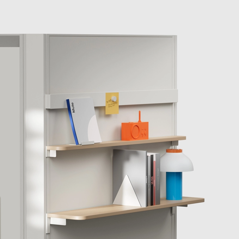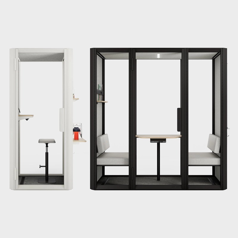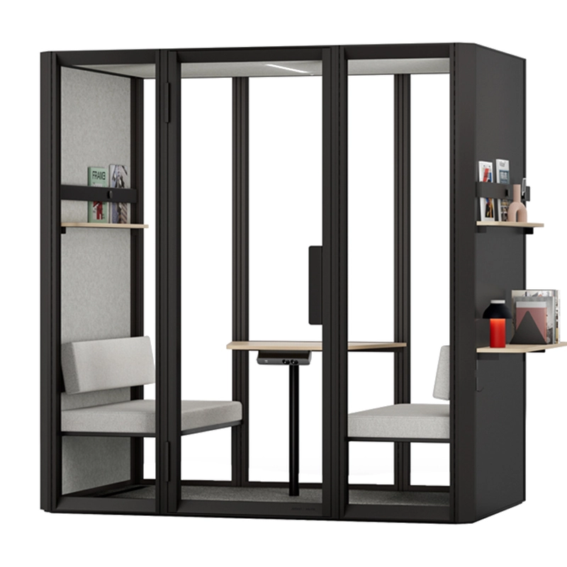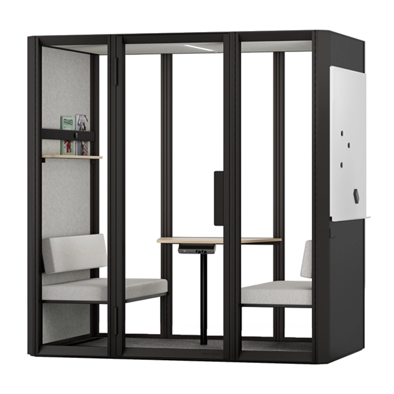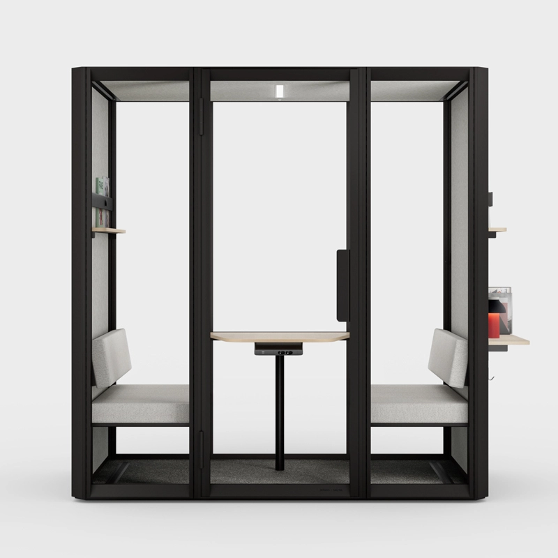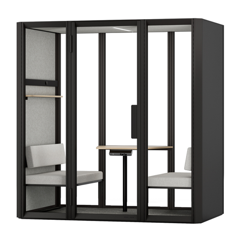 La cabine acoustique Jetson L4 est conçue pour accueillir jusqu'à 4 personnes. Elle est équipée de deux canapés avec dossiers réglables en hauteur, d'une table en mélaminé, d'une étagère étroite avec un rail d'exposition et un aimant, ainsi que d'un crochet mural.