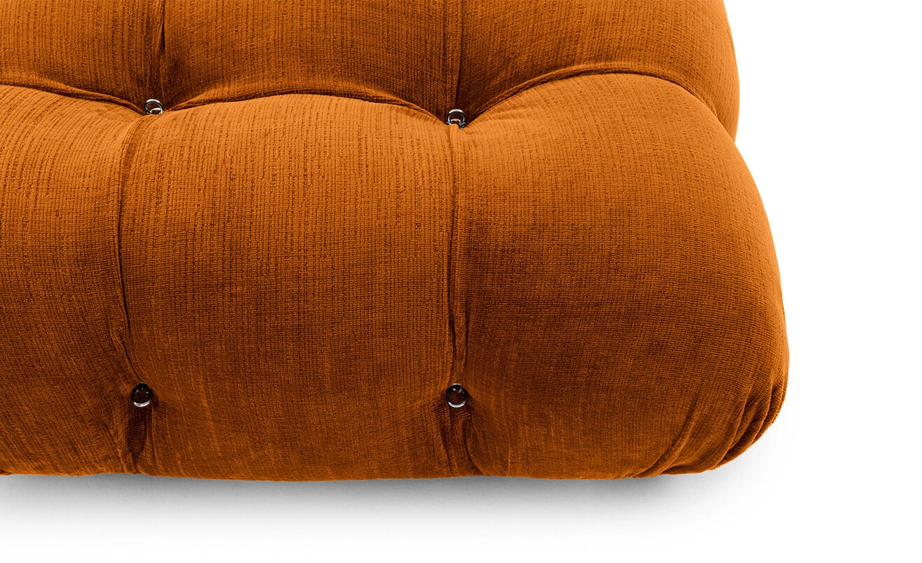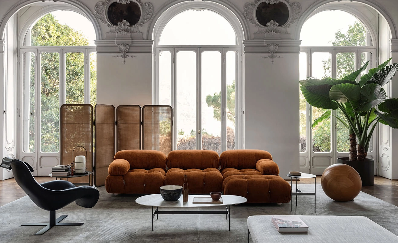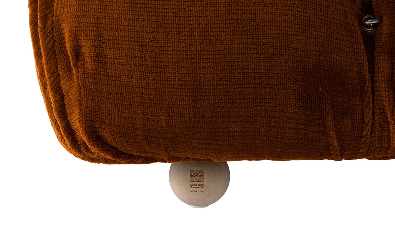 Dans sa réédition, Camaleonda conserve les éléments qui en ont fait un classique contemporain. D’un commun accord, Mario Bellini et le fondateur de B&B Italia, Pierre Ambrogio Busnelli, ont choisi de conserver le module d’assise de 90x90 cm, ainsi que le dossier et l’accoudoir, fidèles au projet d’origine duquel ont également été récupérés les gabarits d’origine pour la coupe du revêtement. Reste également inchangé le rembourrage généreux en polyuréthane, qui forme le capitonnage caractéristique, obtenu à travers l’innovant système de câbles, crochets et anneaux conçu par Bellini en 1970, qui garantissent son aspect et sa modularité. En effet, grâce à des tirants et anneaux, les modules peuvent se détacher et se recomposer à souhait, en permettant au canapé de s’adapter aux goûts évolutifs et aux nécessités dynamiques des utilisateurs. L’architecte et designer Mario Bellini porte sur sa création un regard particulier : « Parmi tous les objets que j’ai conçus, c’est sans doute Camaleonda qui représente le mieux le concept de liberté. Les configurations que l’on peut obtenir sont infinies. » Le canapé Camaleonda fut produit de 1970 à 1979. Cependant, en neuf années d’existence, ce canapé modulaire s’est imposé comme une incontestable référence du design italien. Ce n’est donc pas étonnant que cinquante ans après, B&B Italia remet Camaleonda à l’honneur en relançant sa production. Le projet de réédition est lancé en 2019. Il aura fallu près d’une année pour adopter au mieux le canapé aux enjeux actuels. Les matériaux utilisés dans ce canapé sont recyclés et recyclables. La structure de Camaleonda est conçue en panneaux de bois et les pieds sphériques, en hêtre certifié Forest Stewardship Council. Quant à sa housse amovible, le dacron, un tissu synthétique réalisé entièrement en PET recyclé, protège le rembourrage. L’assise de Camaleonda a demandé aux équipes du centre de recherche et développement de B&B Italia un gros travail pour que les diverses couches interagissent les unes avec les autres, qu’elle génère des espaces vides pour créer un effet de ressort moelleux. Le Camaleonda est un objet dynamique, vif et sincère, également modifiable à l’envi en gardant toujours son identité particulière et unique. Une caractéristique fondatrice de Camaleonda est sa modularité pratiquement infinie, une nature géométrique qui permet à chaque élément de devenir une sorte de pixel gigantesque à travers lequel définir son propre environnement domestique. En accrochant et décrochant les assises, les dossiers et les accoudoirs, on peut avoir le luxe de changer d’idée autant de fois qu’on le souhaite, en déplaçant et redessinant l’espace. Camaleonda présente un équilibre magique entre la géométrie rigoureuse du carré et la rondeur accueillante des rembourrages qui souligne encore plus l’élasticité et l’ergonomie tactile qui caractérisent de nombreux projets design de Mario Belline. Camaleonda peut être revêtu en puisant dans l’intégralité de la gamme de tissus et cuirs B&B Italia ce qui permet d’avoir encore plus de combinaisons possibles.