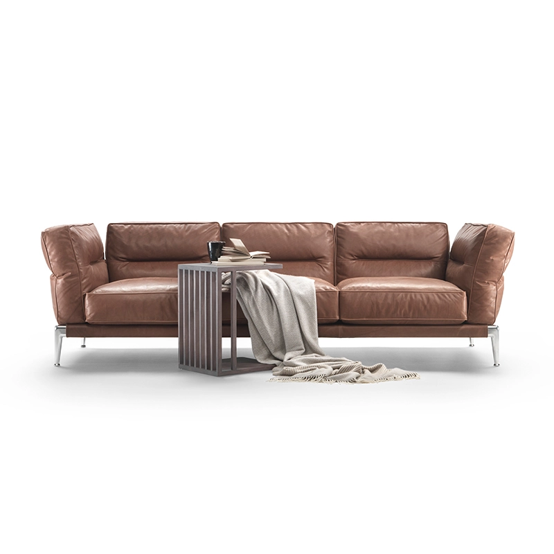 Dessiné par Antonio Citterio pour Flexform, Adda est un canapé qui se démarque par une esthétique épurée et contemporaine. Il arbore une structure légère et des coussins au garnissage généreux en duvet d’oie, caractérisés par un cordon qui en souligne les formes douces et accueillantes. Le canapé Adda de Flexform est surélevé du sol par un piètement en métal, recouvert de cuir ou de tissu, tandis que les pieds apparents en fonte d'aluminium révèlent un dessin gracieux, néanmoins d'un style résolument contemporain. Les moelleux coussins des accoudoirs et du dossier se fixent sur le piètement par un système à baïonnette simple et efficace. Dans le sens de la longueur, les coussins sont sillonnés par une couture originale qui produit une légère ondulation de la surface du revêtement – tissu ou cuir – et accentue le pli naturel qui se crée lorsque l'on s'appuie, devenant un signe distinctif du canapé Adda. Contactez-nous pour plus d’informations.