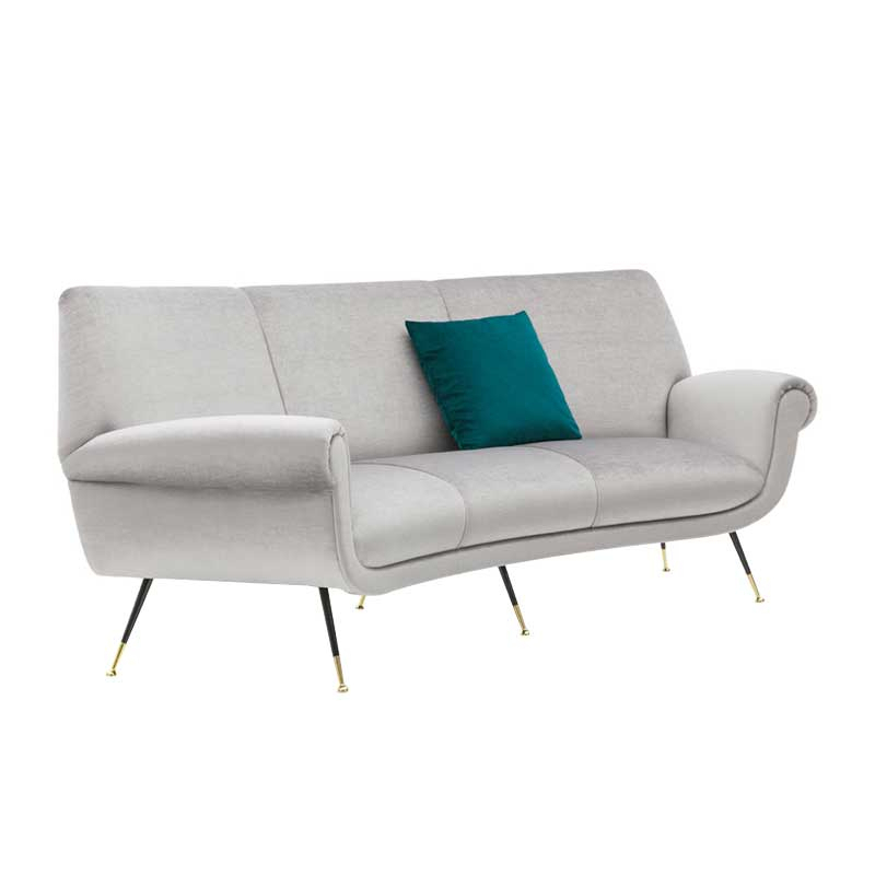 Albert empruntent la ligne classique 1900 réinterprétée par l’esthétique des années cinquante. Un élément frontal décoratif s'étend sur toute la longueur et dessine l'accoudoir. Réalisé en bois massif, il est d'abord tapissé puis fixé avec des clous à la structure principale. Un revêtement velours en laine de mohair aux reflets scintillants et aux couleurs vibrantes met particulièrement en valeur les assises