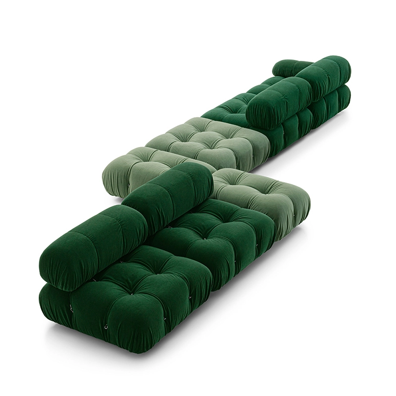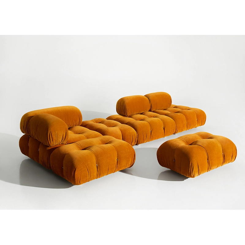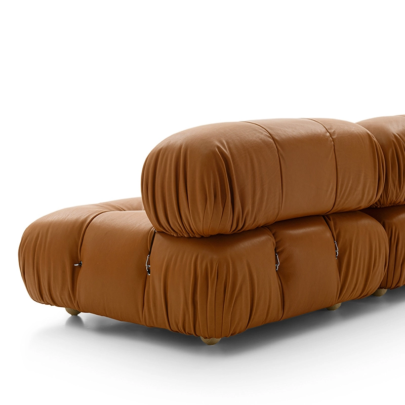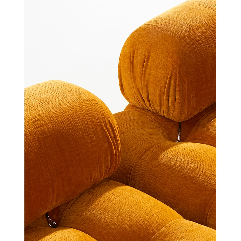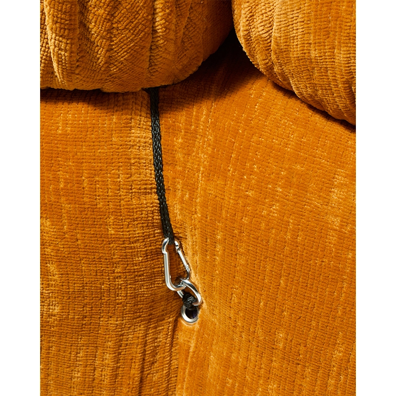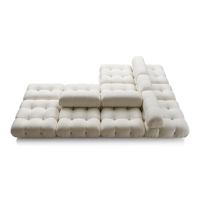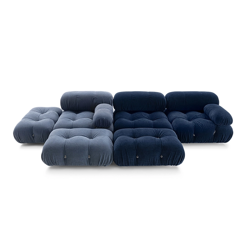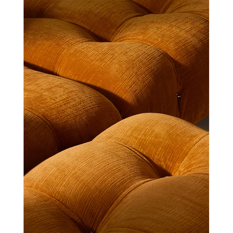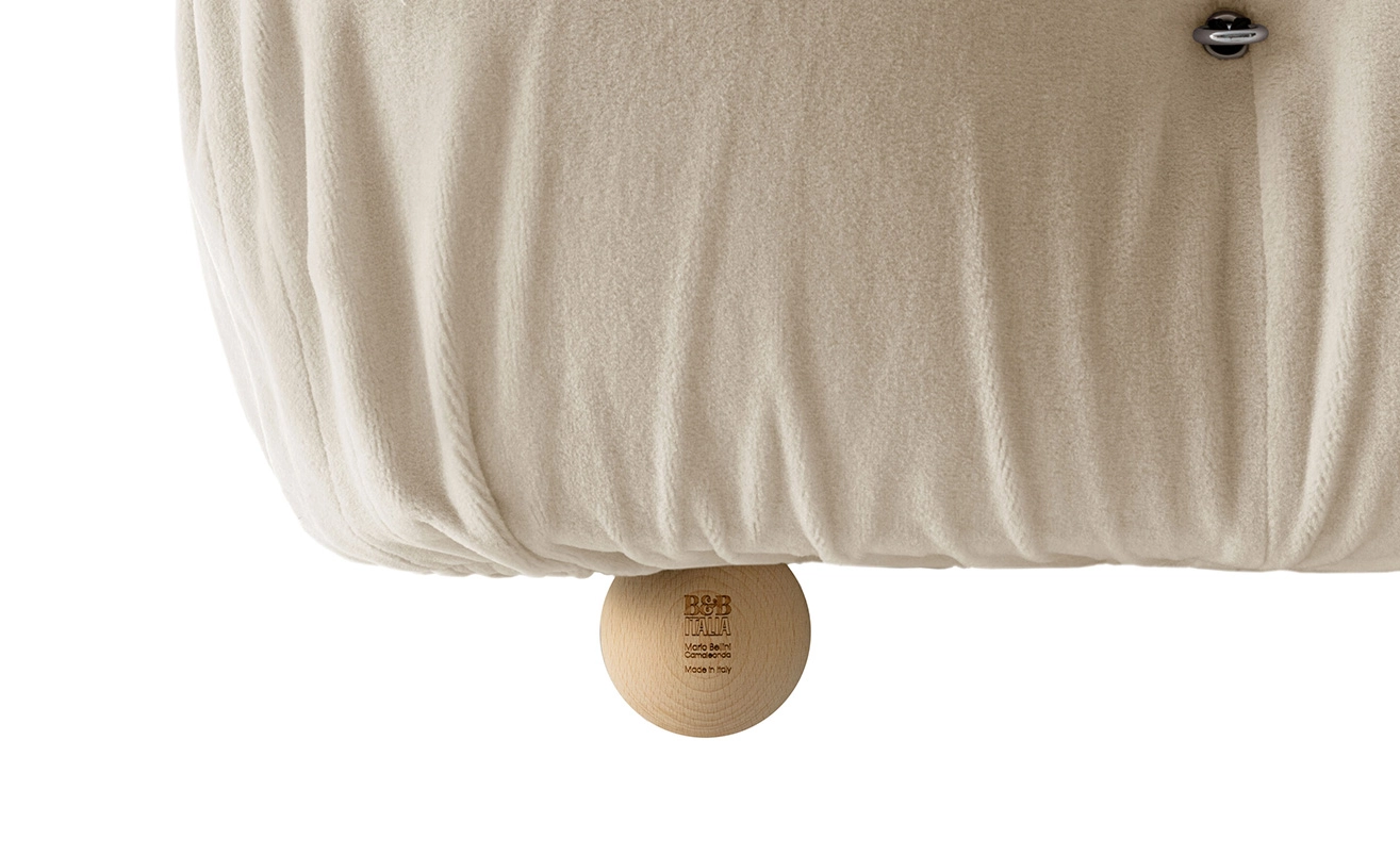 B&B Italia, Pierre Ambrogio Busnelli, ont choisi de conserver le module d’assise de 90x90 cm, ainsi que le dossier et l’accoudoir, fidèles au projet d’origine duquel ont également été récupérés les gabarits d’origine pour la coupe du revêtement. Reste également inchangé le rembourrage généreux en polyuréthane, qui forme le capitonnage caractéristique, obtenu à travers l’innovant système de câbles, crochets et anneaux conçu par Bellini en 1970, qui garantissent son aspect et sa modularité. En effet, grâce à des tirants et anneaux, les modules peuvent se détacher et se recomposer à souhait, en permettant au canapé de s’adapter aux goûts évolutifs et aux nécessités dynamiques des utilisateurs. L’architecte et designer Mario Bellini porte sur sa création un regard particulier : « Parmi tous les objets que j’ai conçus, c’est sans doute