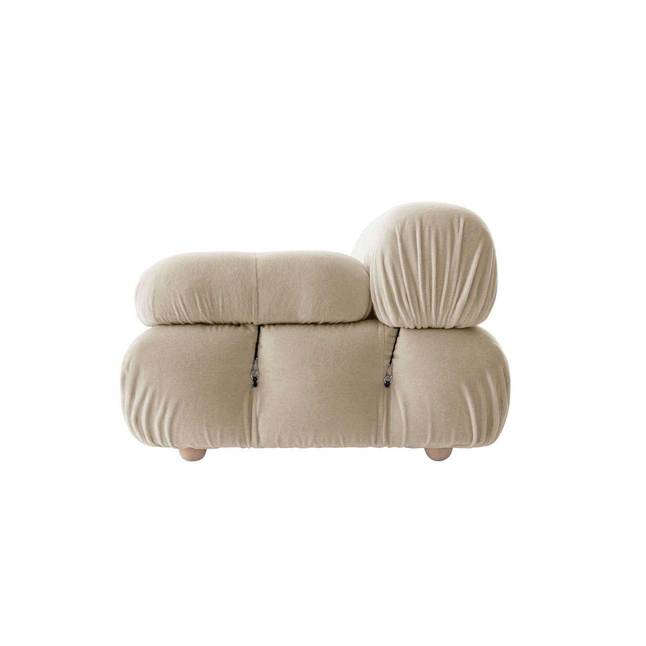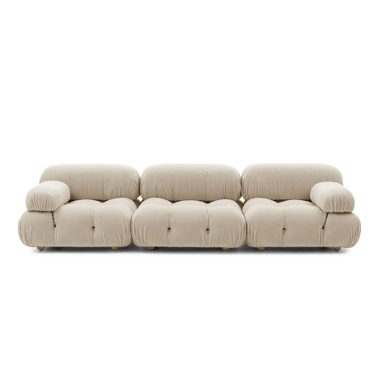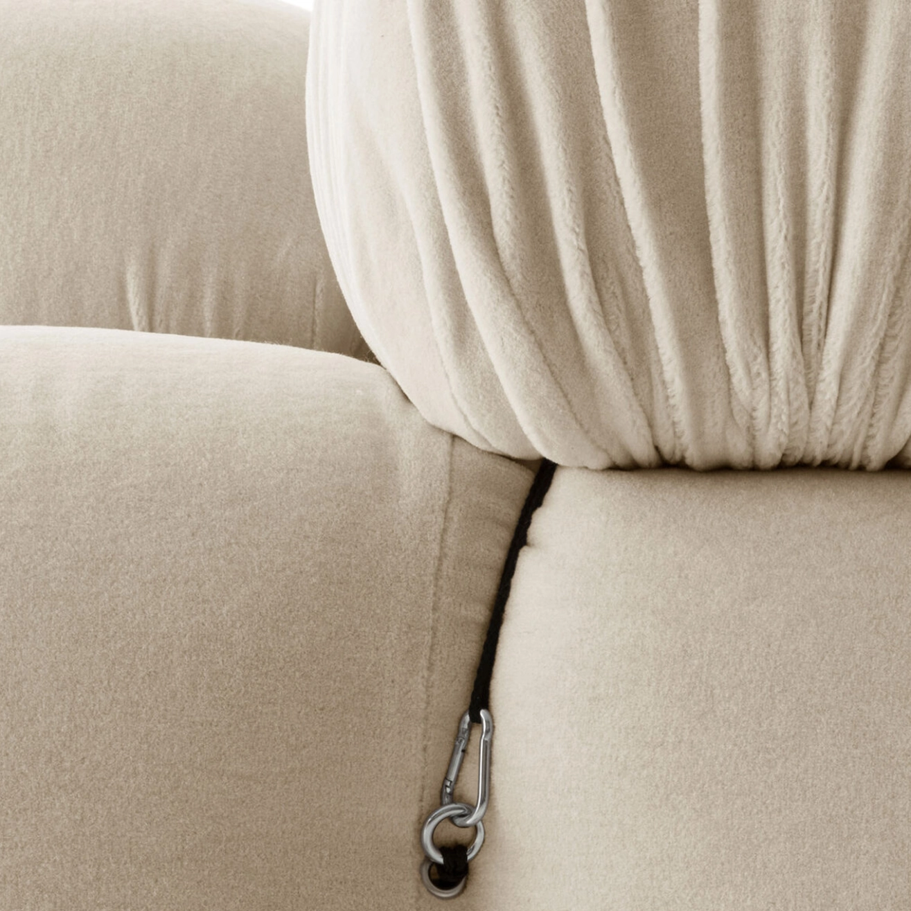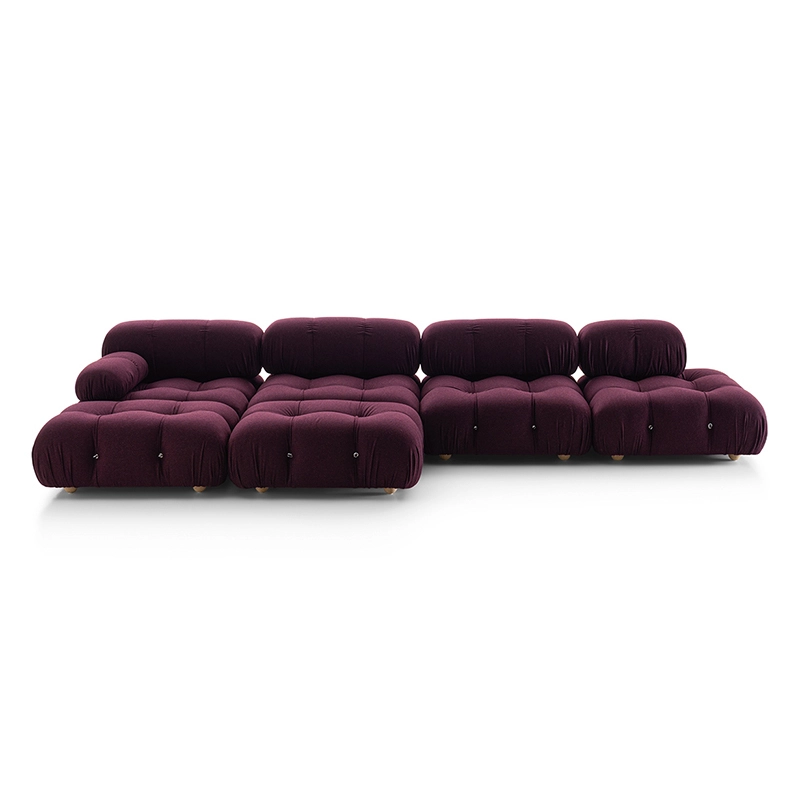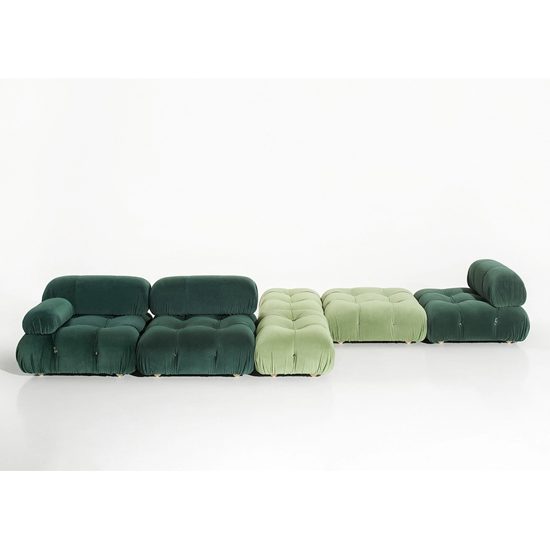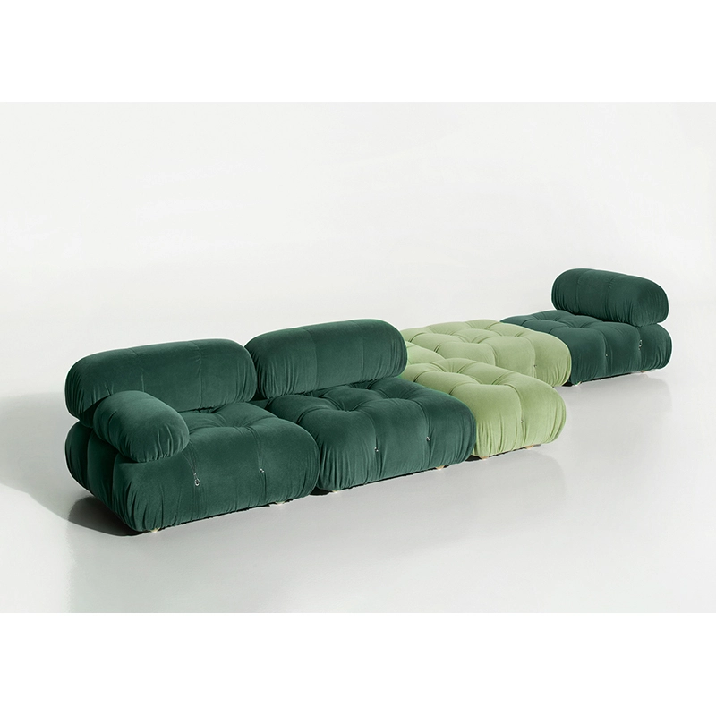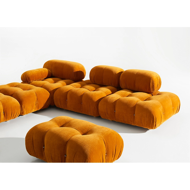 B&B Italia, Pierre Ambrogio Busnelli, ont choisi de conserver le module d’assise de 90x90 cm, ainsi que le dossier et l’accoudoir, fidèles au projet d’origine duquel ont également été récupérés les gabarits d’origine pour la coupe du revêtement. Reste également inchangé le rembourrage généreux en polyuréthane, qui forme le capitonnage caractéristique, obtenu à travers l’innovant système de câbles, crochets et anneaux conçu par Bellini en 1970, qui garantissent son aspect et sa modularité. En effet, grâce à des tirants et anneaux, les modules peuvent se détacher et se recomposer à souhait, en permettant au canapé de s’adapter aux goûts évolutifs et aux nécessités dynamiques des utilisateurs. L’architecte et designer Mario Bellini porte sur sa création un regard particulier : « Parmi tous les objets que j’ai conçus, c’est sans doute