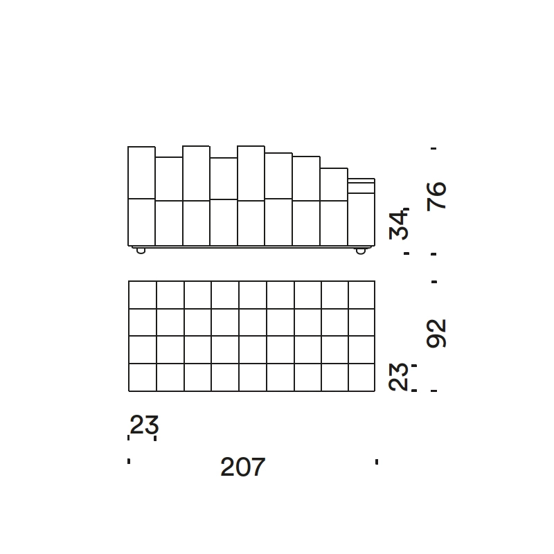 l 207 x p 92 x h 80 cm, assise h 38 cm
