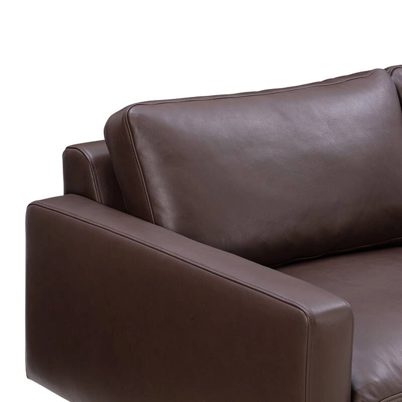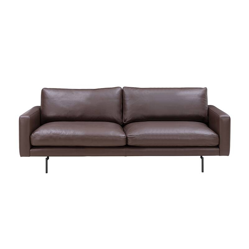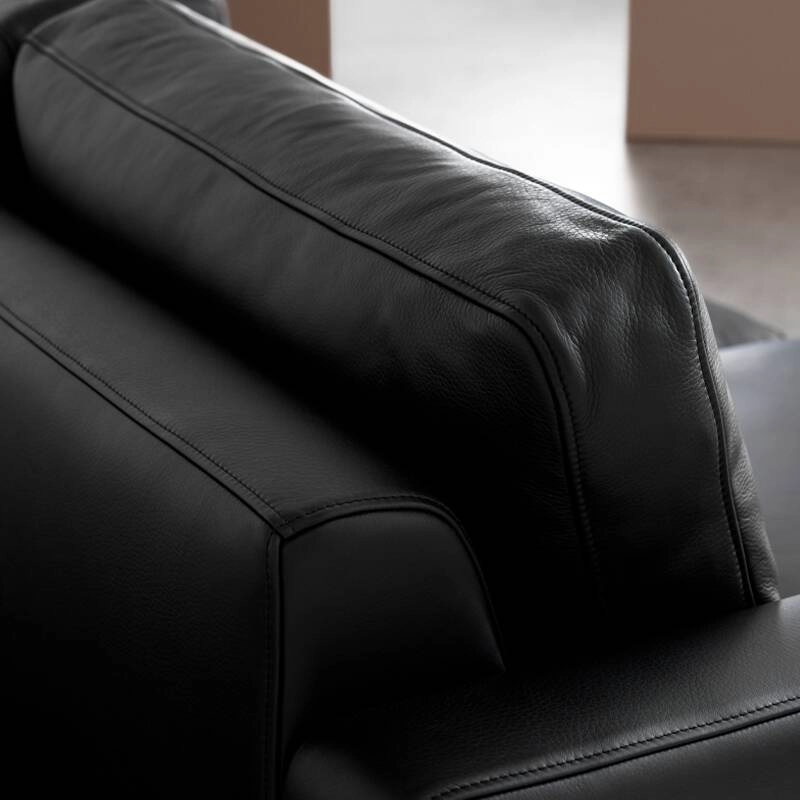 housse amovible cuir, rembourrage mousse polyuréthane, duvet, plumes et balles de fibre, pieds acier finition époxy noir