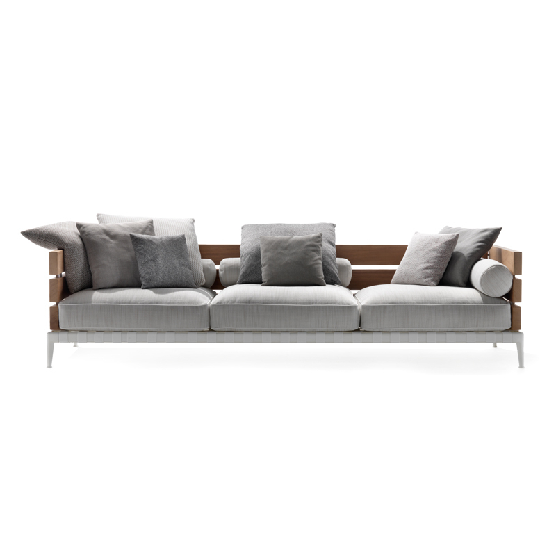 Les canapés Ansel se démarquent par une combinaison inhabituelle de matériaux : la structure des accoudoirs et des dossiers en lattes d'iroko s'insère dans le piétement rigoureux en acier inox. Le résultat est surprenant et révèle un équilibre parfait entre la puissance expressive du bois et la légèreté du piétement en inox, peint à la poudre époxy dans une gamme de couleurs raffinées, et muni de sangles élastiques déperlantes. Le confort est assuré par les coussins d'assise moelleux, généreusement rembourrés et terminés par un élégant passepoil en gros-grain qui peut être réalisé ton sur ton ou en contraste. Le dossier accueille des coussins rouleaux sur lesquels sont disposés des coussins de différentes tailles qui améliorent le confort du canapé et produisent un agréable effet décoratif. Edités par Flexform, les canapés Ansel sont disponibles en deux profondeurs – 84 et 124 cm – et en version deux ou trois places. Il est vivement recommandé d'utiliser les housses imperméables appropriées pour garder les canapés Atlante en bonne condition et pour préserver au maximum leur état d'origine.