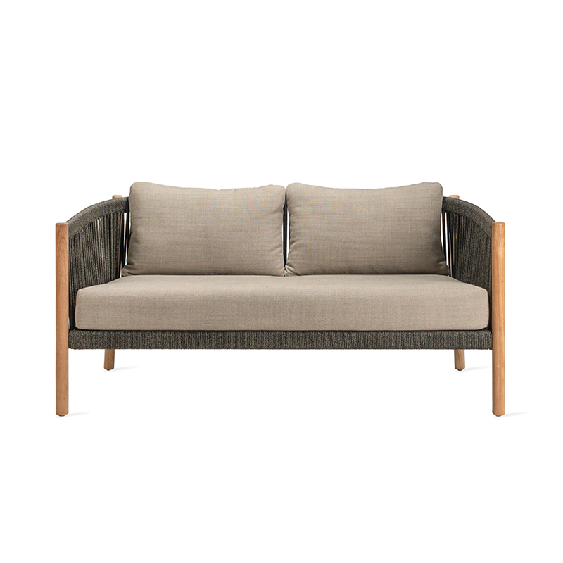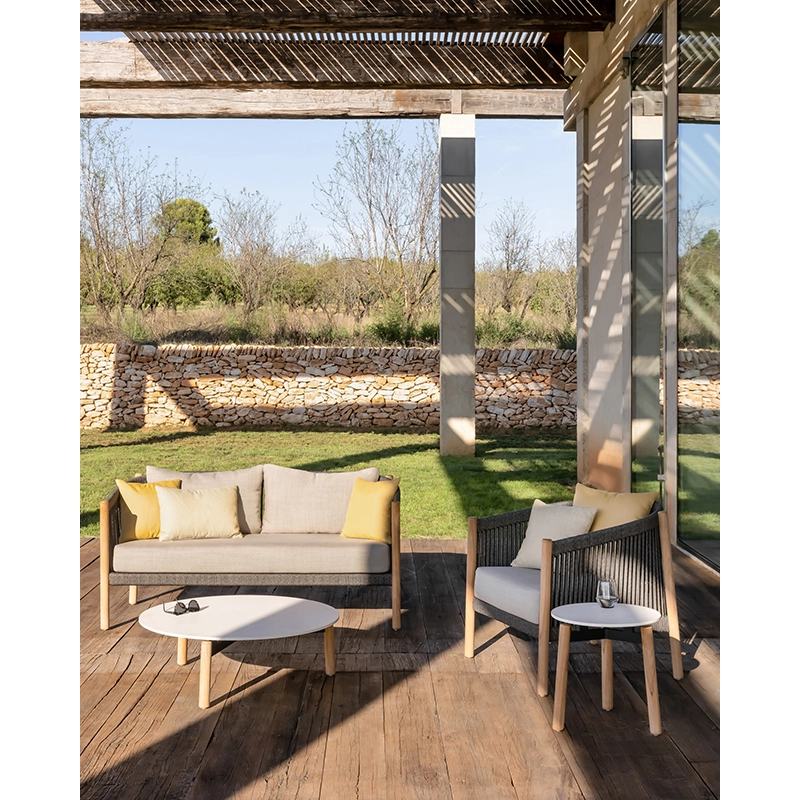 corde polypropylène, aluminium thermolaqué, teck non traité, coussins mousse quick dry et nylon, tissu outdoor