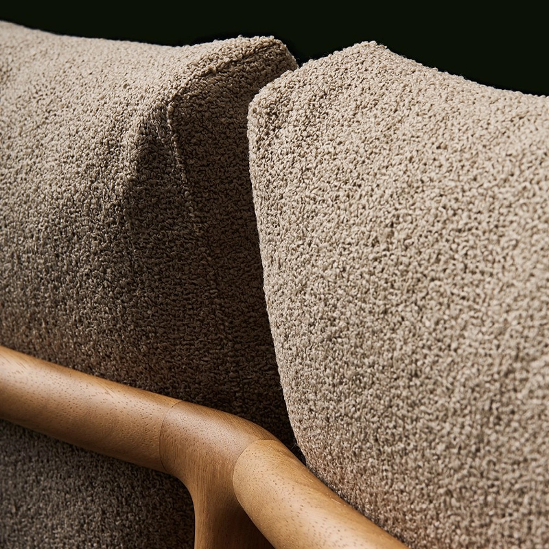 cadre en bois de chêne massif, assise en polyester recyclé avec insert en polyuréthane, revêtement en tissu déhoussable