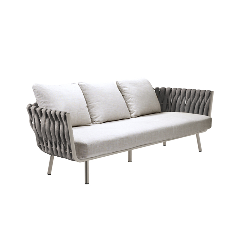 La collection de meubles d'extérieur Tosca de la marque Tribu est à la fois accueillante et chaleureuse, chic et intrigante. C'est la première fois que Tribu fait appel à Monica Armani, qui a conçu cette luxueuse collection chargée d’émotion et de féminité, combinant des assises au tressage vertical extra large soutenues par des pieds effilés légèrement convergents. Les matériaux utilisés pour la création du canapé Tosca 3 places le tressage du dossier est sans aucun doute innovant : une mousse  recouverte d'une gaine tricotée non seulement résistante aux intempéries, mais qui est aussi extrêmement douce au toucher avec un aspect totalement naturel. Le canapé Tosca 3 places, avec ses formes ultra-généreuses, est le cadre idéal pour lézarder et rêver au soleil. Le confort d'assise est très moelleux, grâce aux confortables coussins avec un rembourrage spécifiquement conçu pour l'extérieur.