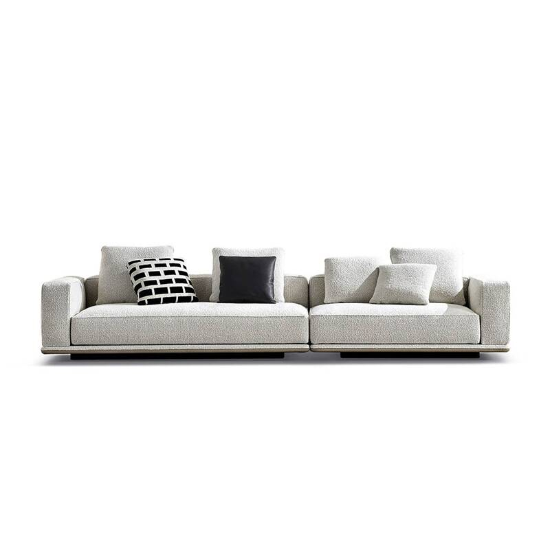 Horizonte est le résultat d'une vision architecturale claire : un trait déterminé, surélevé de sept centimètres du sol grâce à une plinthe en métal peint en noir mat, qui donne au canapé une sensation de suspension particulière. Une plateforme sur laquelle se placent les éléments rembourrés - sièges, dossiers et accoudoirs - tous conçus comme de grands coussins aux proportions bien marquées et à la forte personnalité.